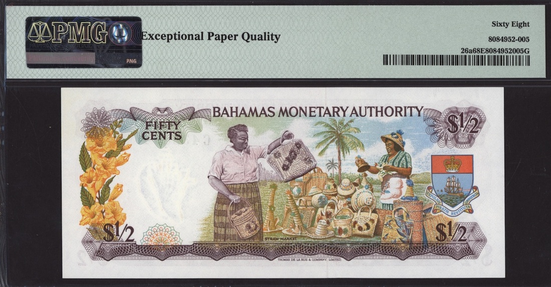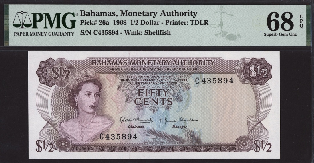 (x) Bahamas Monetary Authority, [Top Pop] 1/2 dollar, 1968, serial number C435892, (Pick 26a), in PMG holder 68 EPQ Superb Gem Unc