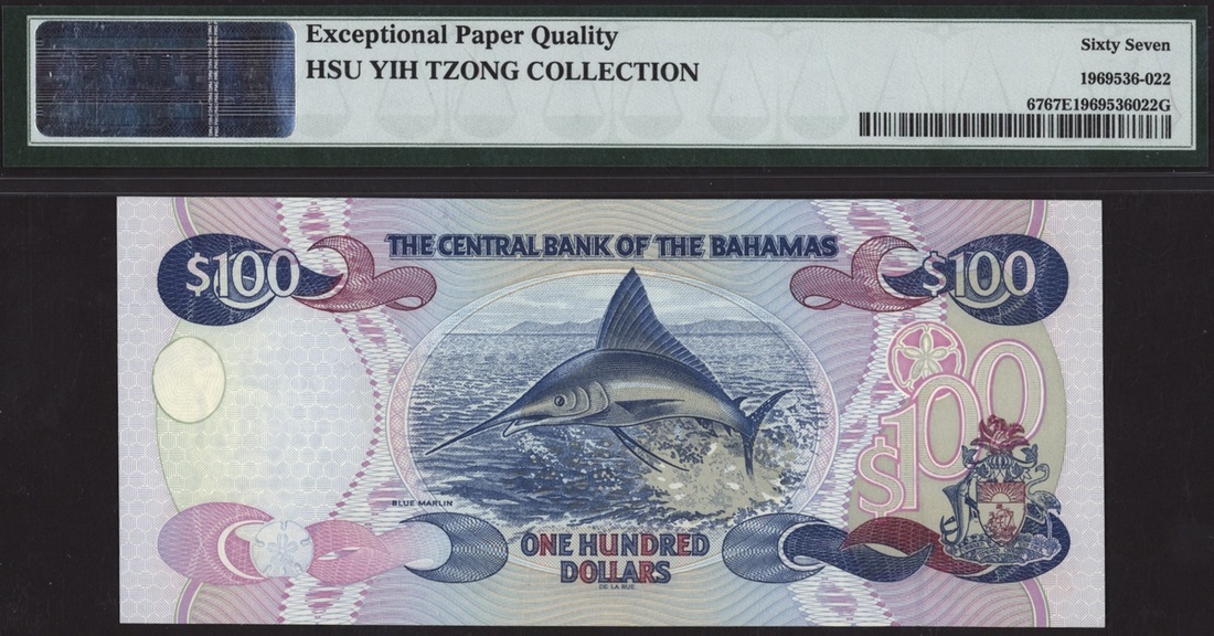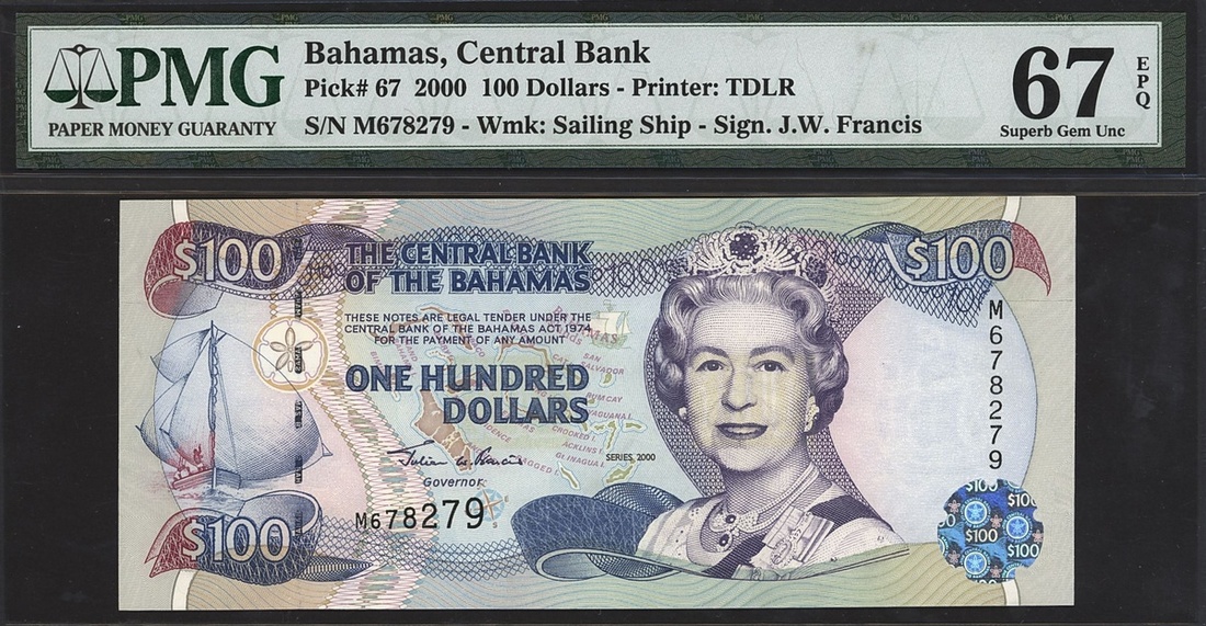 (x) The Central Bank of Bahamas, 100 dollars, 2000, serial number M678279, (Pick 67), in PMG holder 67 EPQ Superb Gem Uncirculated, only 4 notes in higher grade