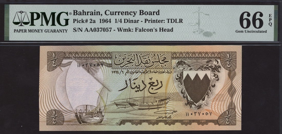 (x) Bahrain Currency Board, 1/4 dinar, 1964, serial number AA037057, (Pick 2a, BNB 102), in PMG holder 66 EPQ Gem Uncirculated