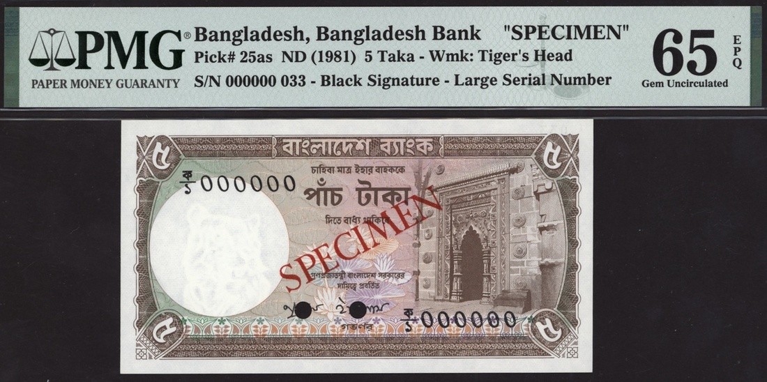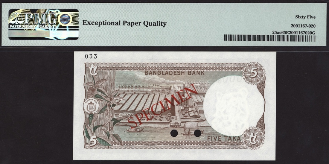 (x) Bangladesh Bank, specimen 5 taka, ND (1981), (Pick 25as), in PMG holder 65 EPQ Gem Uncirculated
