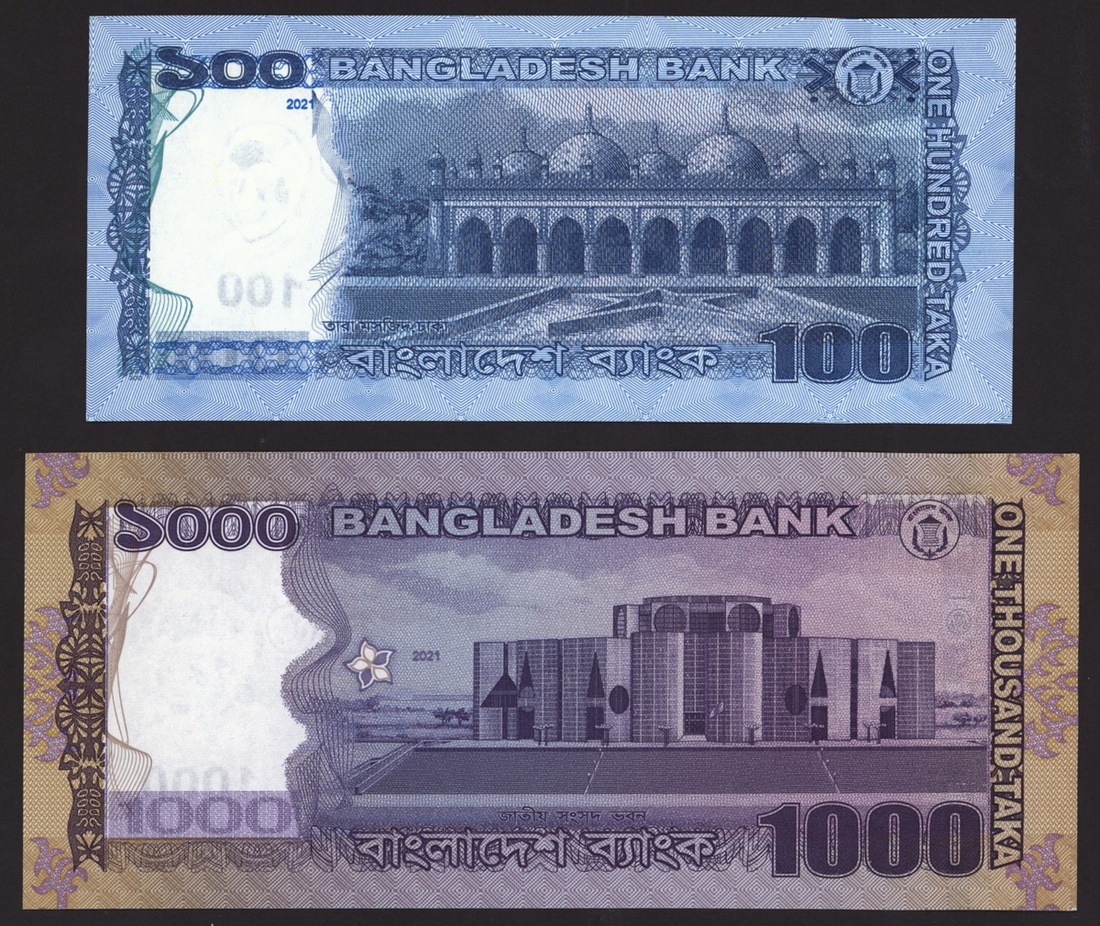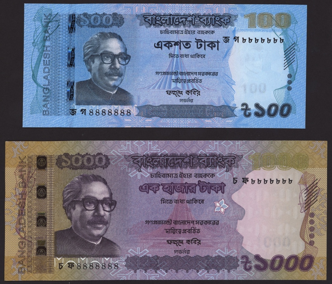 (x) Bangladesh Bank, a group of solid number notes, including 100 daka (4) 2021, serial numbers 111111, 333333, 555555, 888888, 500 daka 2016 serial number 777777, 1000 daka 2021, serial number 888888,