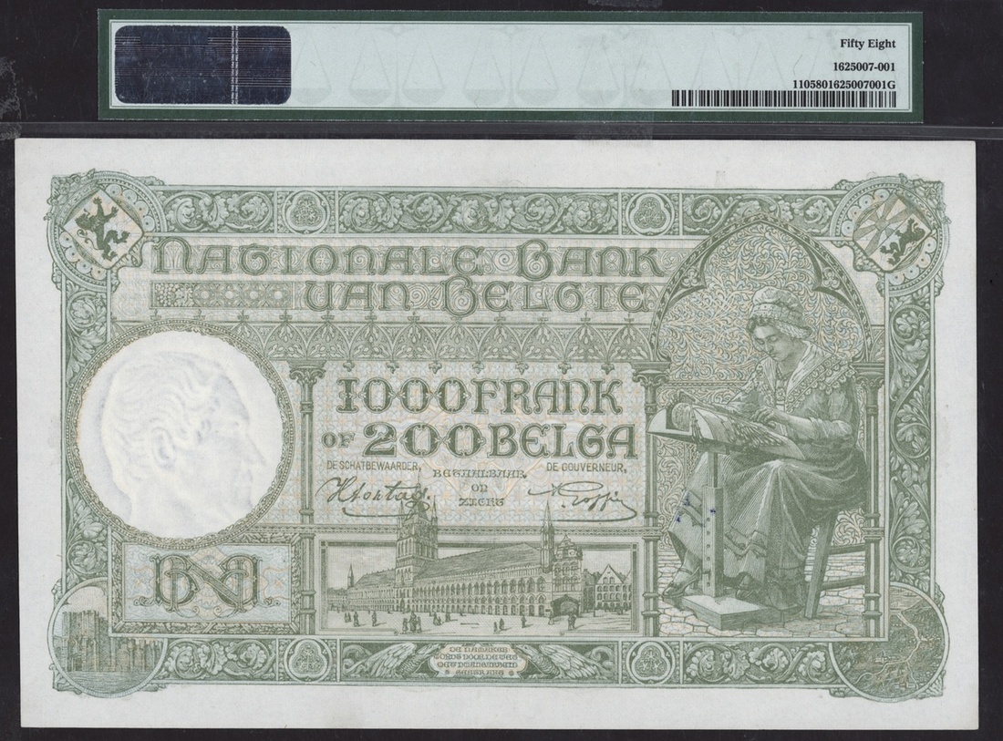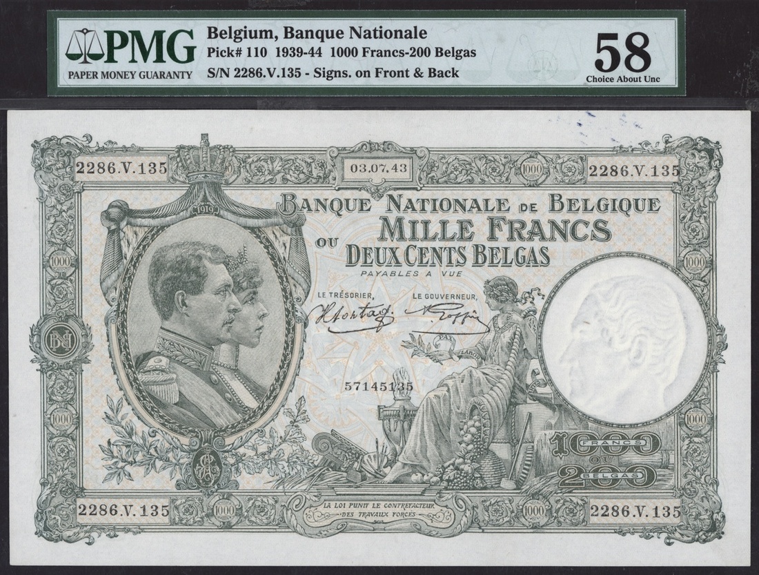(x) Banque Nationale de Belgique, 1000 francs = 200 belgas, 1939-44, serial number 2286.V.135, (Pick 110), in PMG holder 58 Choice About Uncirculated