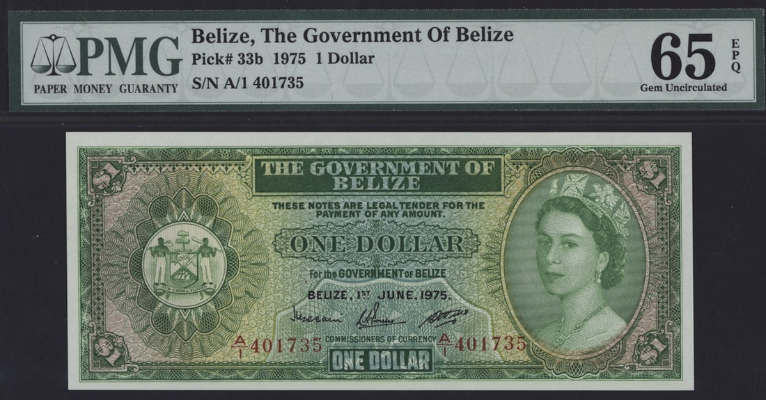 The Government of Belize, 1 dollar, 1975, serial number A/1 401735, (Pick 33b), in PMG holder EPQ 65 gem uncirculated.