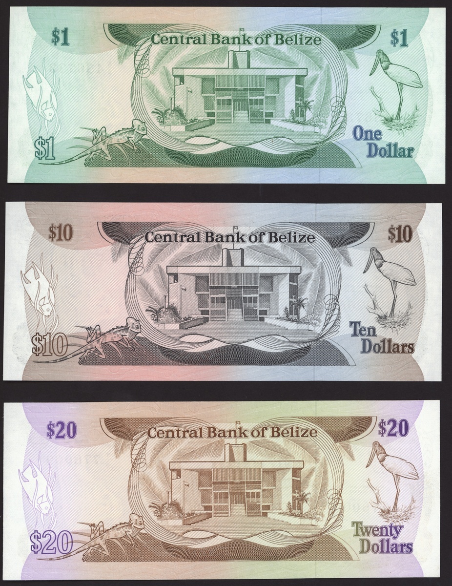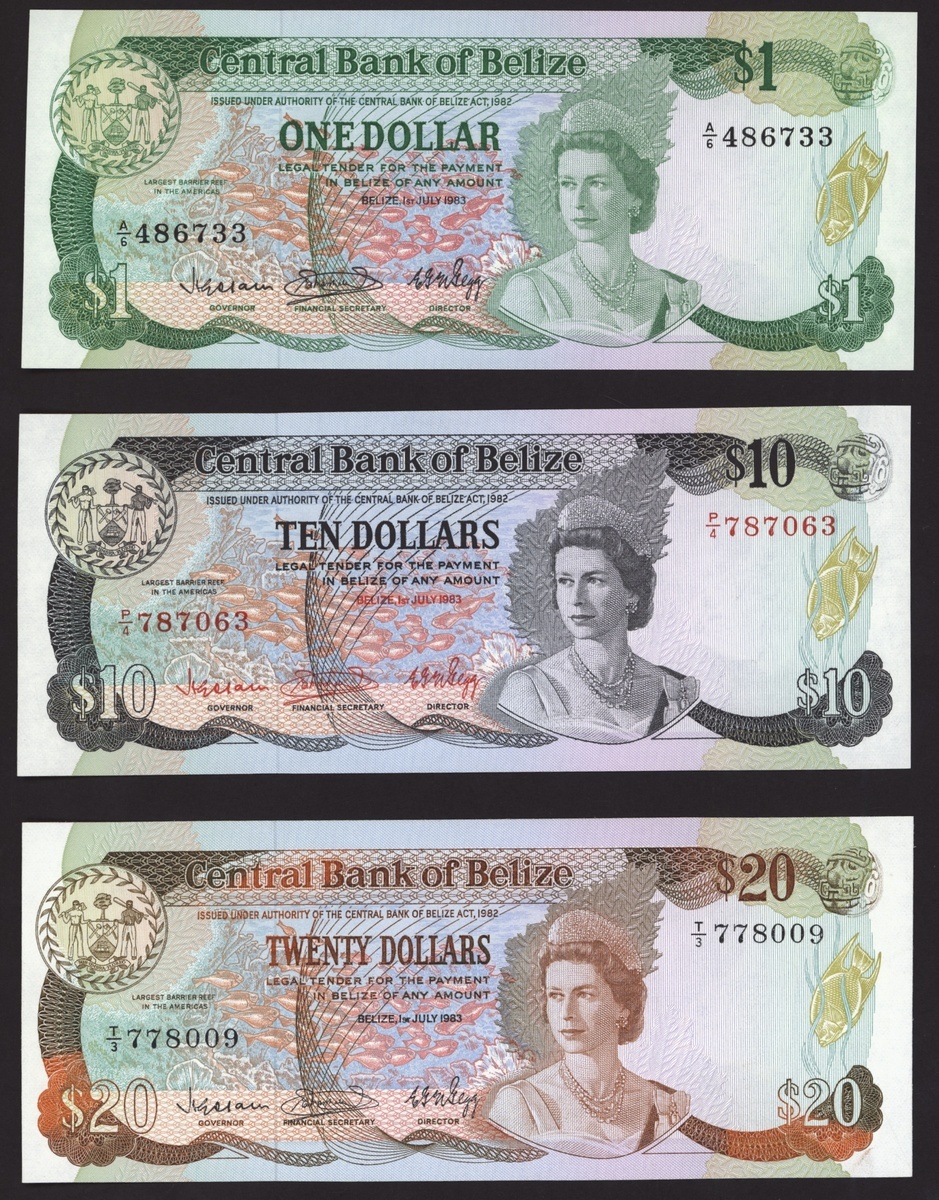 Central Bank of Belize, $20, $10, $1, 1983, serial number T/3 778009, P/4 787063, A/6 486733, (Pick 45a, 44a, 43a, BNB B303a, B302a, B301a), uncirculated (3 notes).