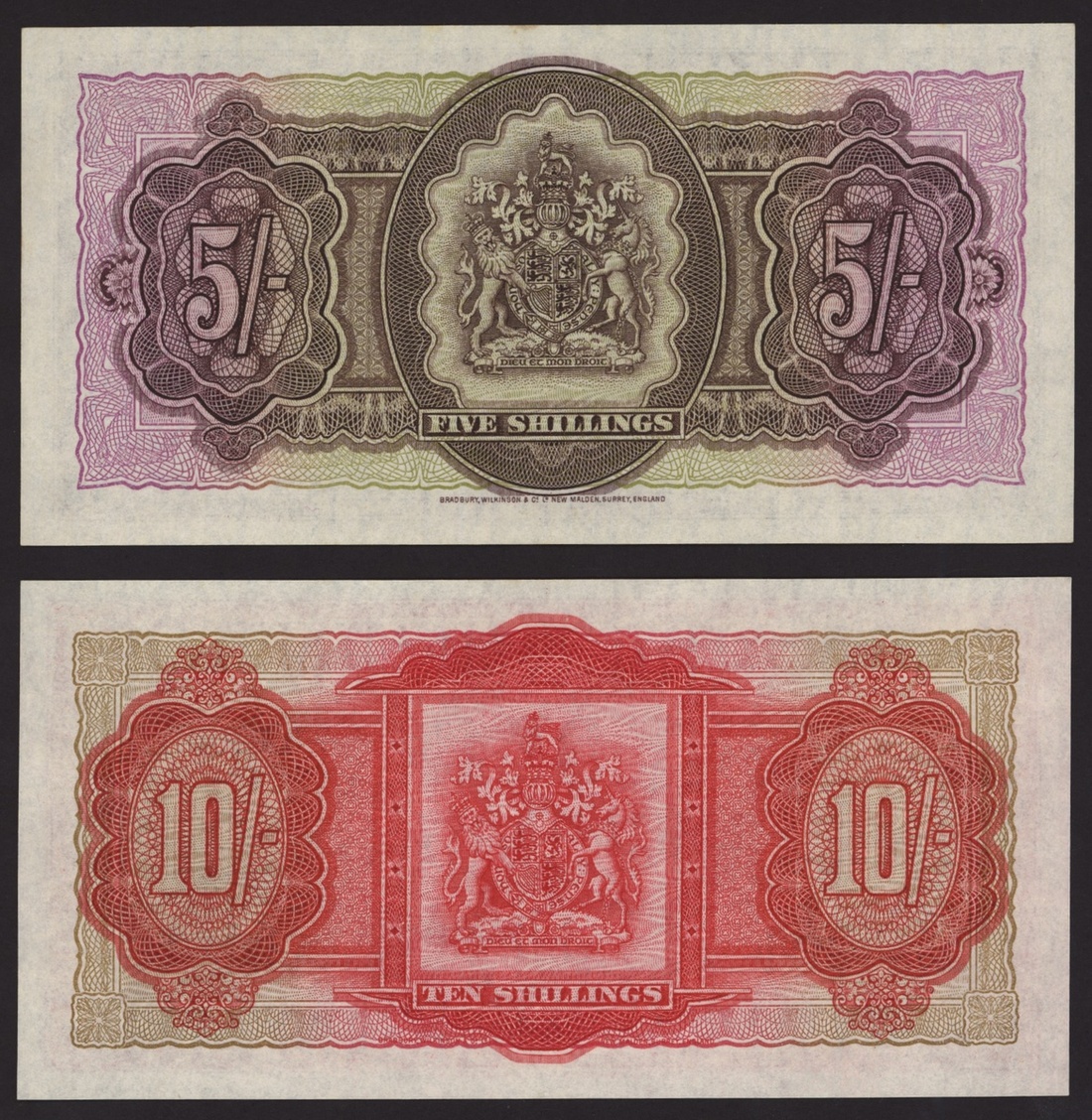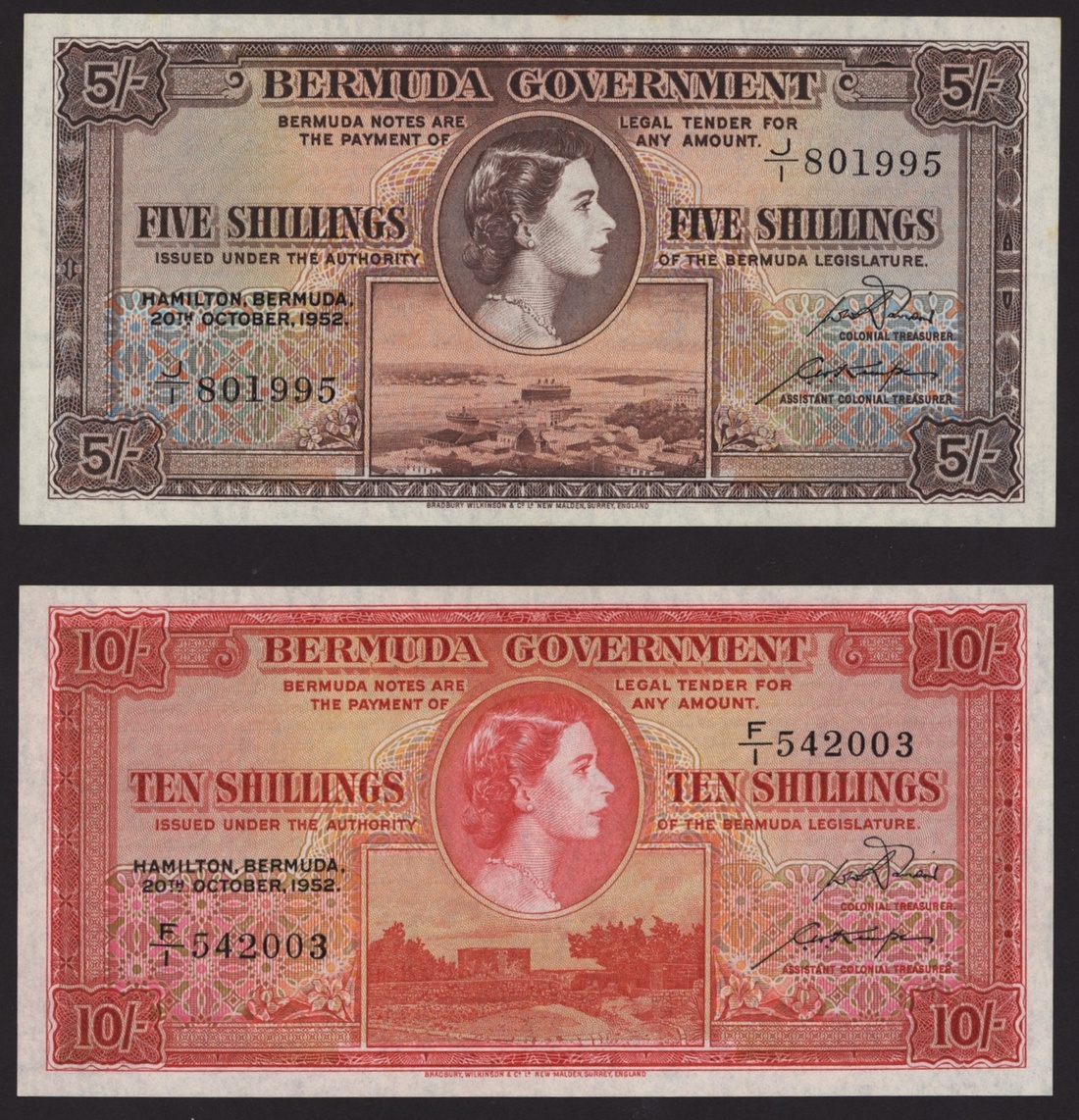 Bermuda Government, 5 shillings, 10 shillings, 1952, J/1 801995, F/1 524003, (Pick 15a, 19a, B119a, B120a), about uncirculated, (2 notes).