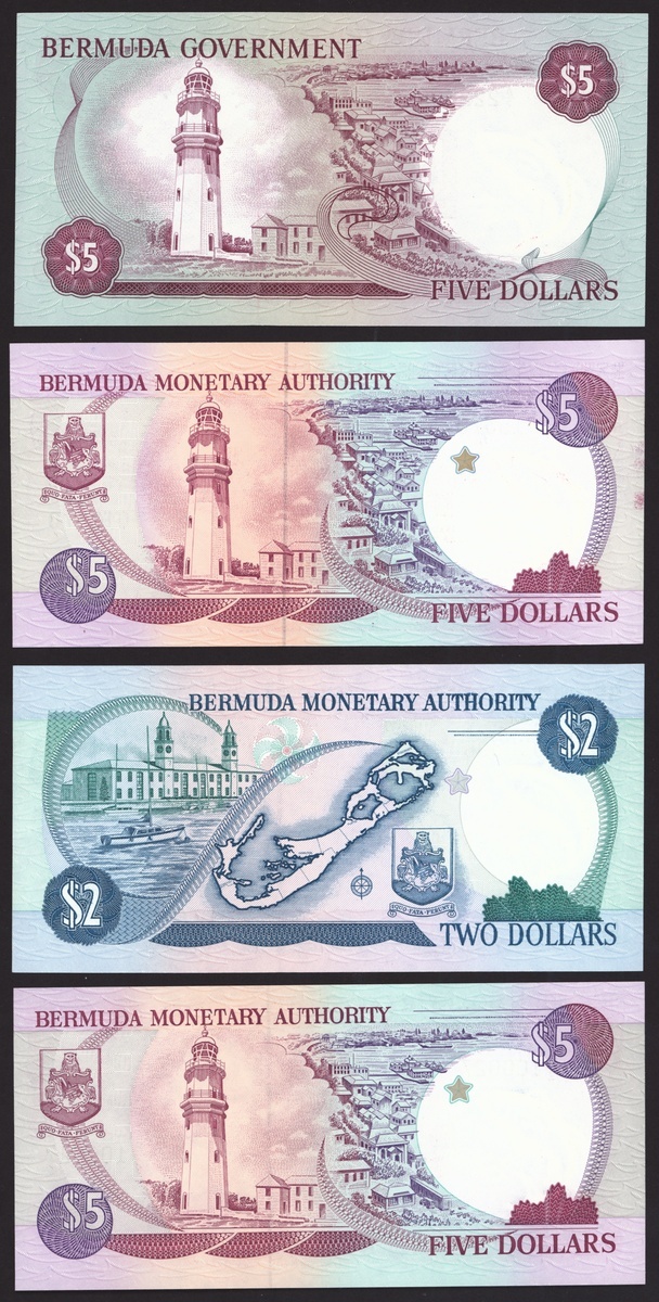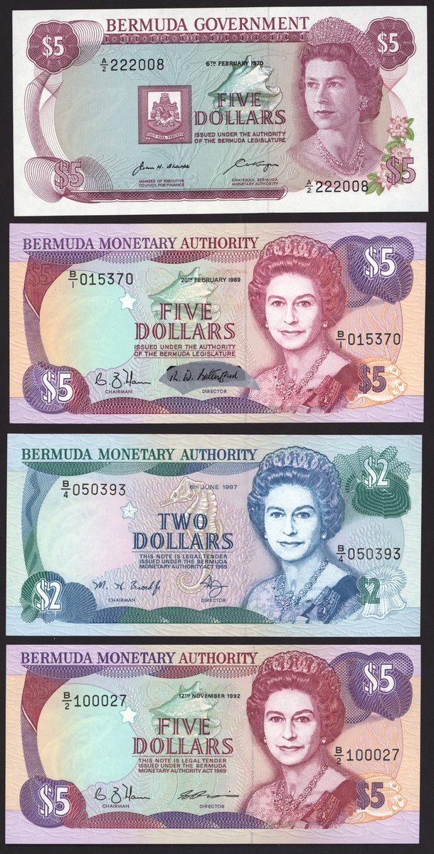 (x) Bermuda, including a government issue $5 1970, Monetary authority issue $5 1989 (with silver patch), $5 1992, serial number B/2 100027 (number 27 note),