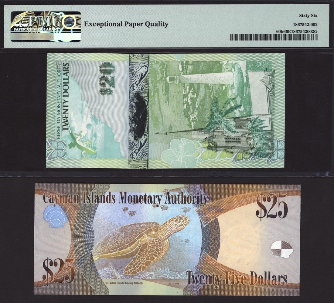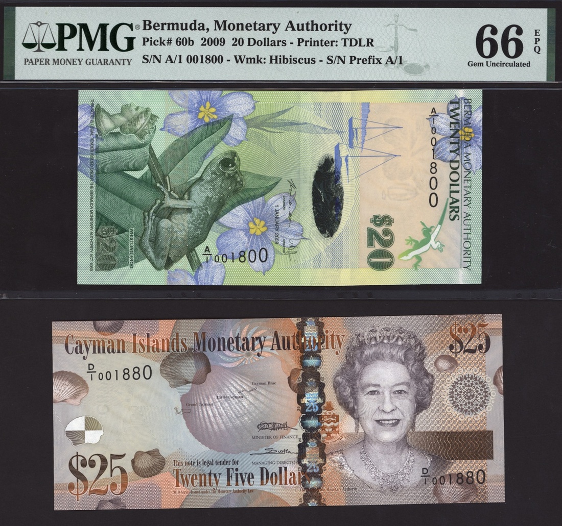 (x) A pair of Caribbean notes with interesting numbers, Including Bermuda $20 2009, serial number 001800, Cayman Islands $25 2011, serial number D/1 001880, (Pick 60b, 41), in PMG holder 66 EPQ Gem Uncirculated, uncirculated (2 notes)