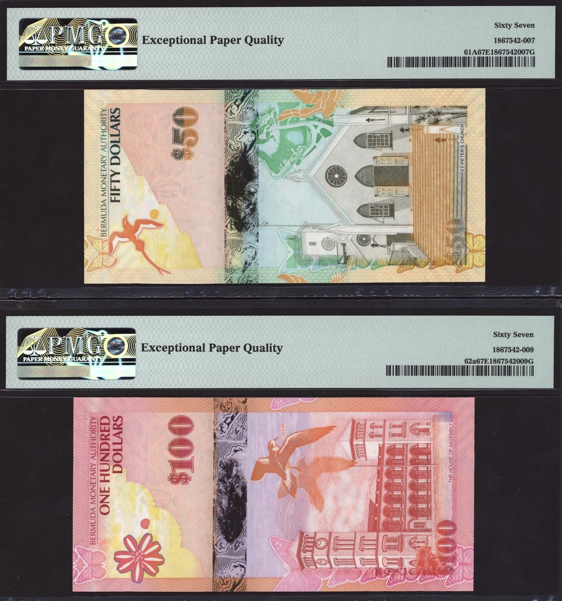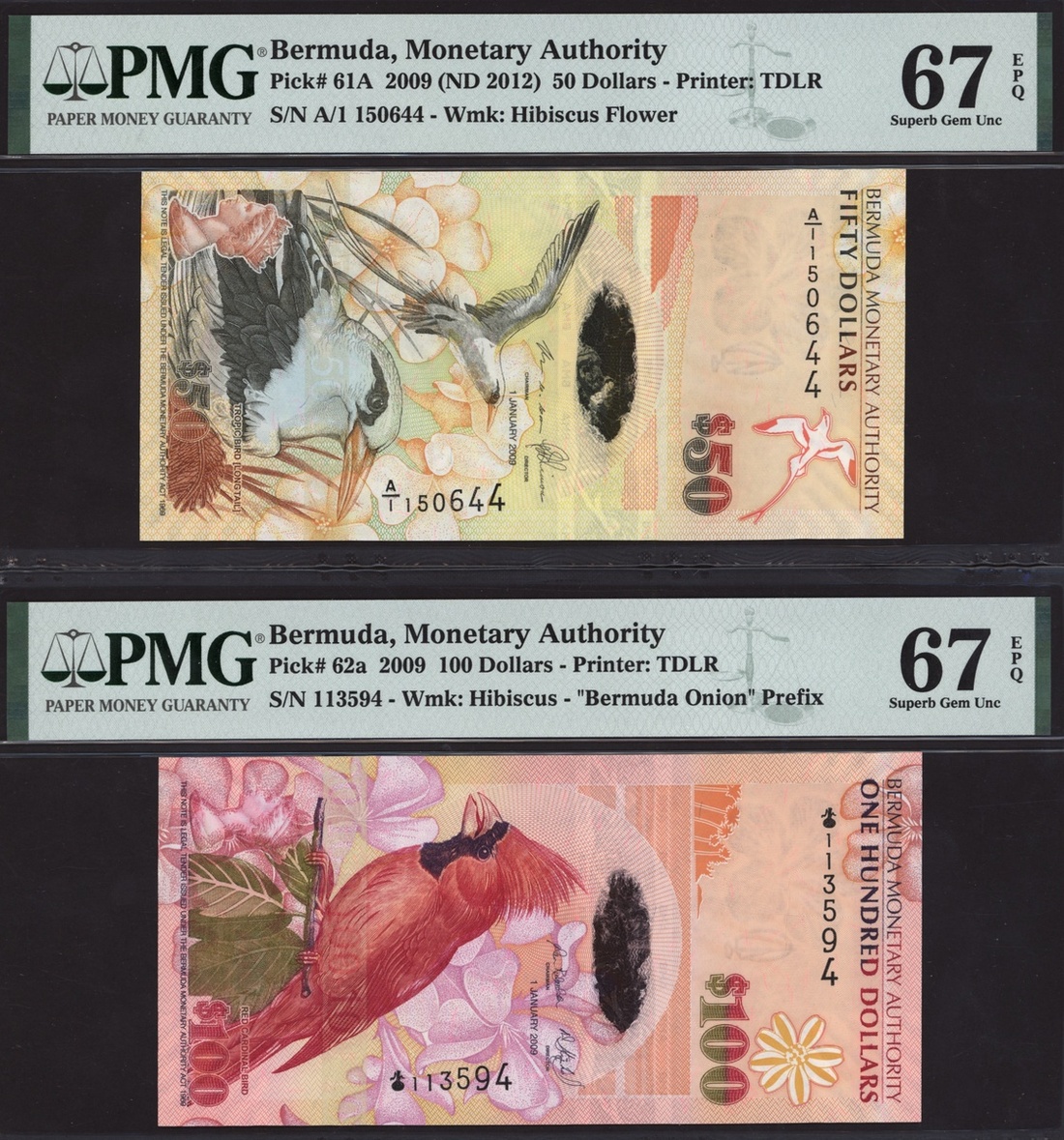 (x) Bermuda Monetary Authority, 50 and 100 dollars, 2009, (Pick 61A, 62a), both in PMG holders 67 EPQ Superb Gem Unc (2 notes)