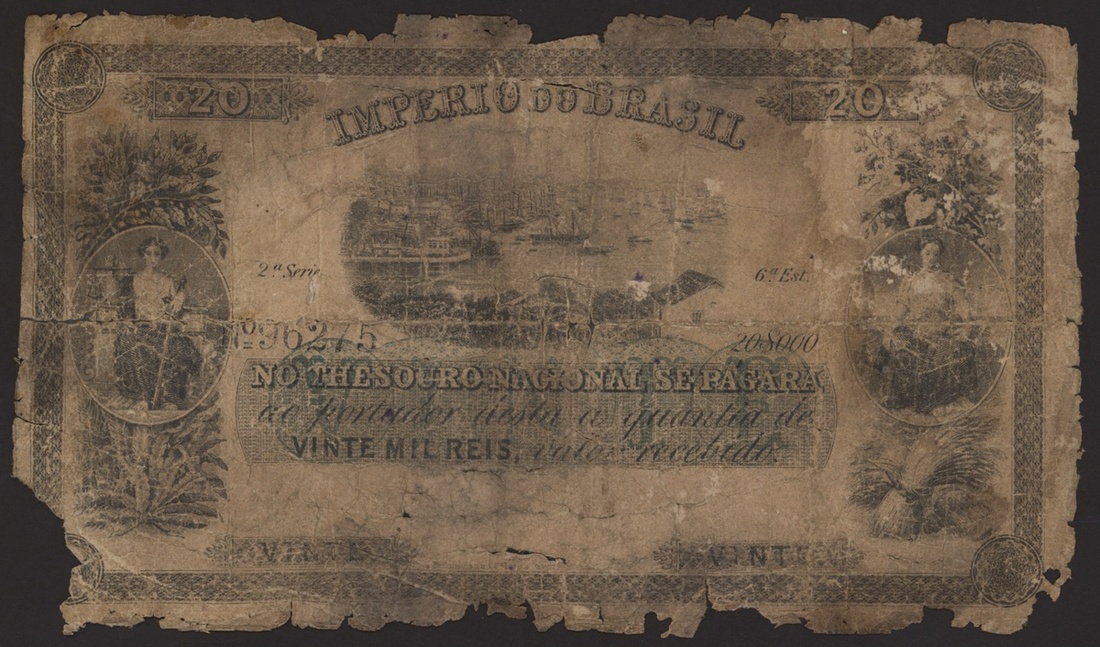 (x) Imperio do Brasil, 20000 reis, estampa 6, serial number 96275, black and white with green guilloche at centre, allegorical female figure at left and right, Rio de Janeiro harbour at centre