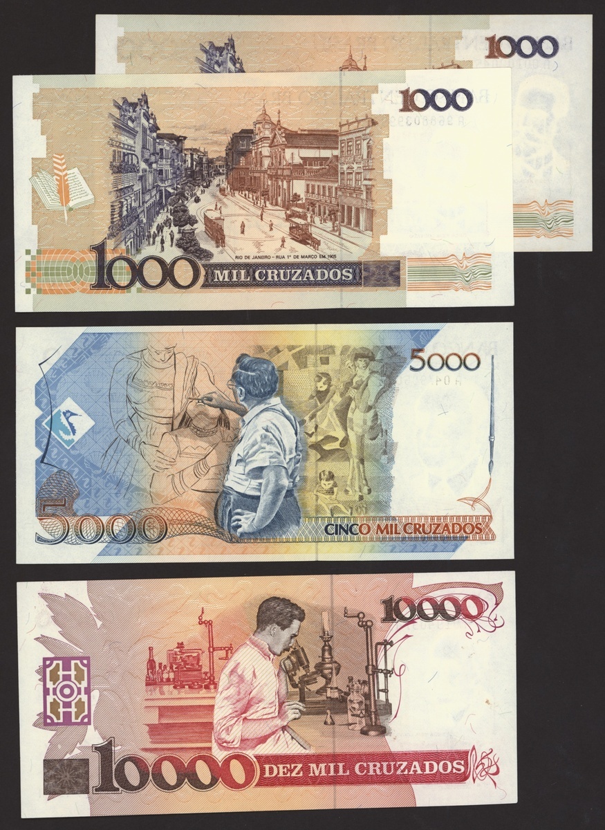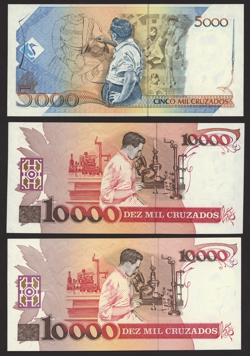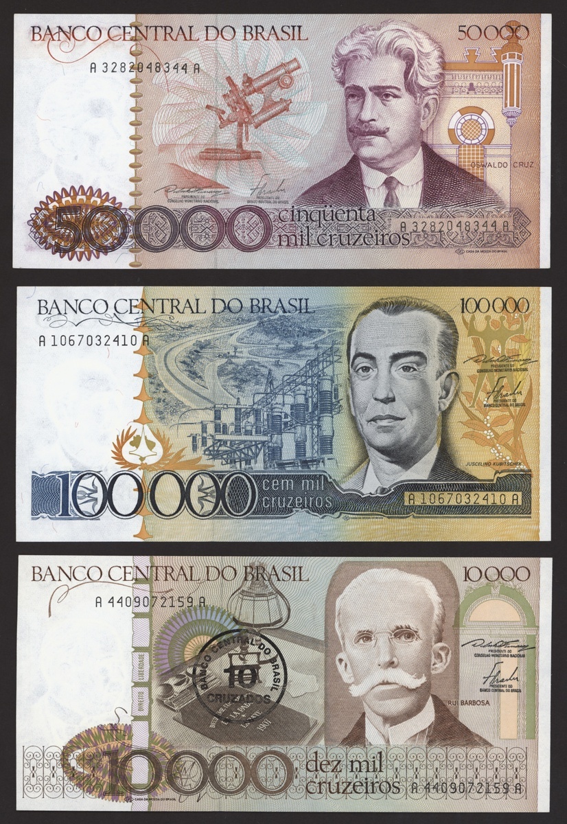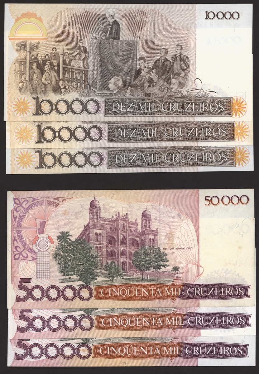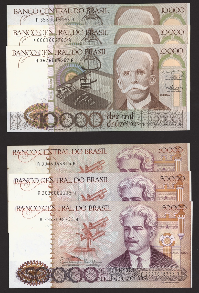 Banco Central do Brasil, a group from 1984-1994, 10,000 cruzeiros including a replacement (3), 50,000 cruzeiors (4), 100,000 cruzeiros, 1984-86 issues, 10 cruzados (2), 50 cruzados (2), 100 cruzados (2) 1986 provisional issues with one issued and one replacement, 10 cruzados (2), 50 cruzados (3), 100 cruzados (4), 1986-88 cruzado issues, 500 cruzados (4) 1986-88 issue, 1000 cruzados (2), 5000 cruzados, 10000 cruzados 1987-89 issues, 1 cruzados, 5 cruzados (2), 10 cruzados (2) 1989-1009 provisional cruzados novo issues, 50 cruzados novos (2), 100 cruzados novos (2) 1989-1990 issues, 200 cruzados 1989, 500 cruzados 1990, 50, 100, 200 and 500 cruzeiros 1990 issues, 100, 200, 500, 1000 (2), 5000 (3), 10000 (3), 50000, 100,000 (4), 500,000 (3), 1990-93 issues, 5,000 cruzeiros 1990 issue, 50, 100, 500 (2) 1993 provisional issues, 1,000, 5,000 and 50,000 cruzeiros reais, 1993-94 issues,