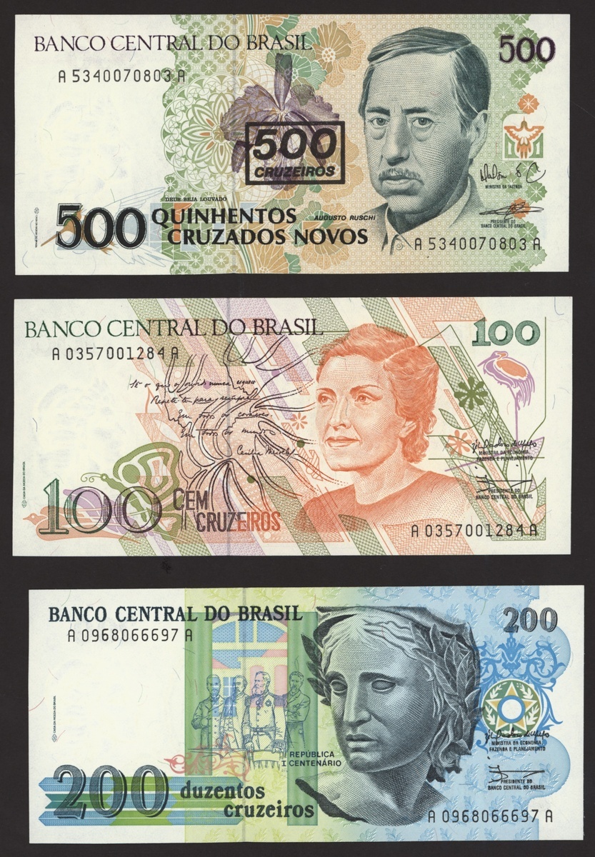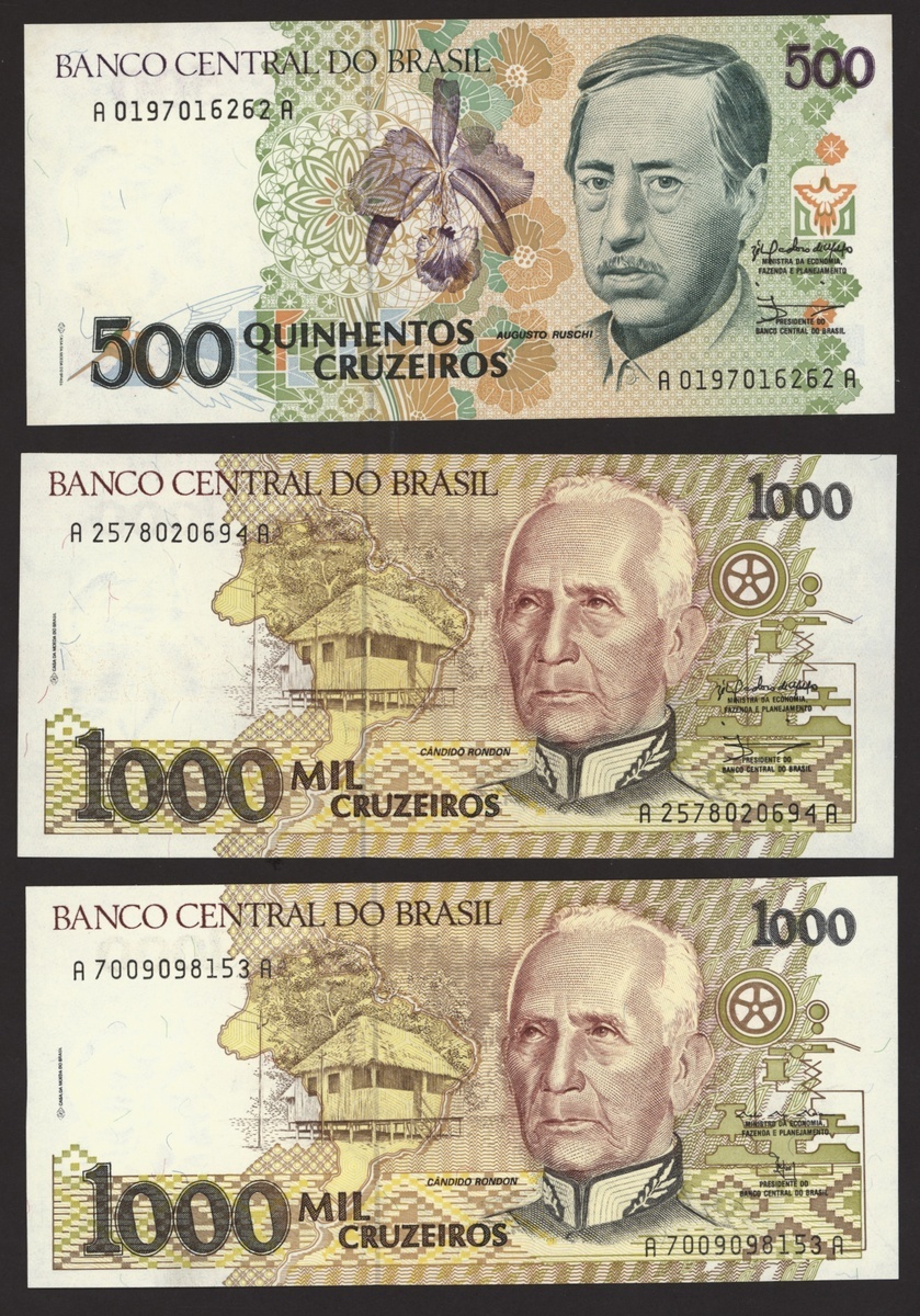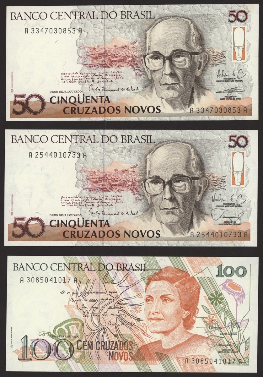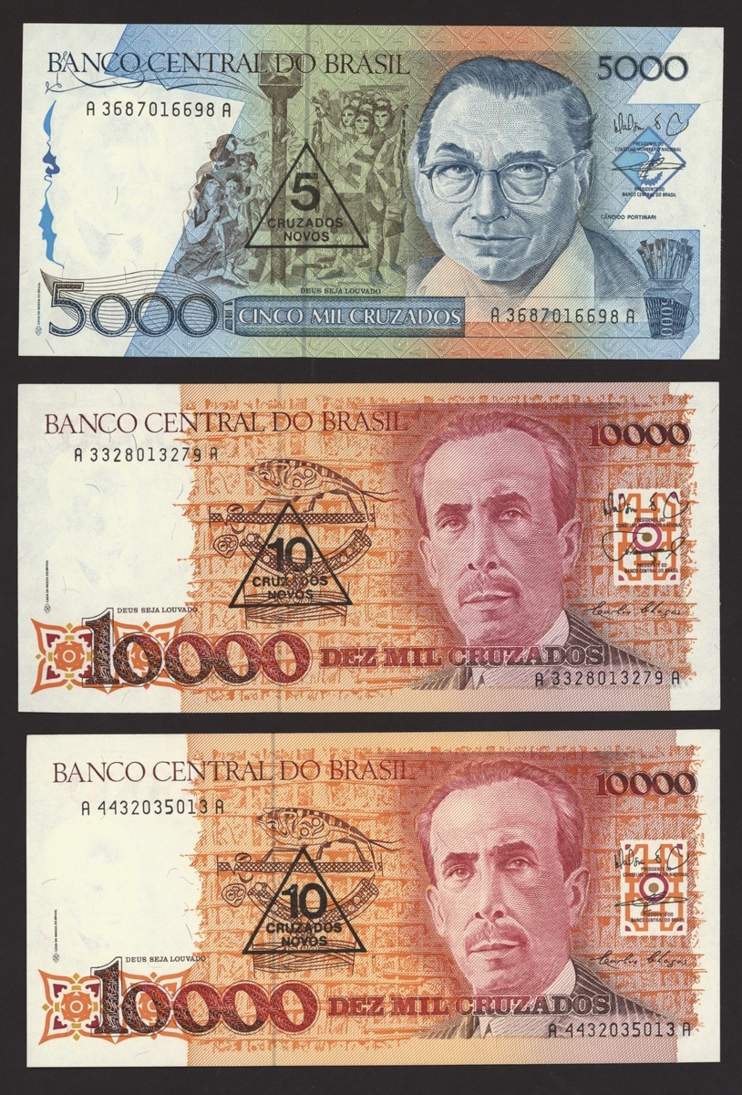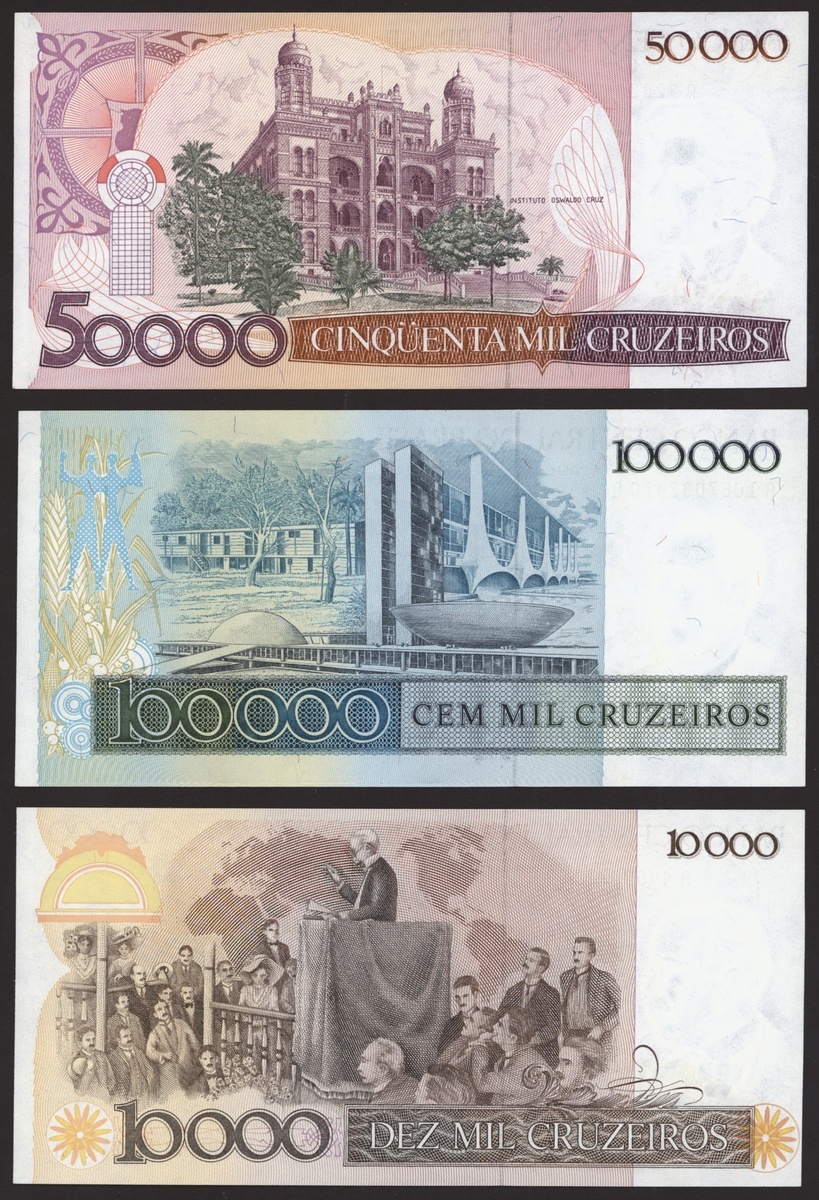 Banco Central do Brasil, a group from 1984-1994, 10,000 cruzeiros including a replacement (3), 50,000 cruzeiors (4), 100,000 cruzeiros, 1984-86 issues, 10 cruzados (2), 50 cruzados (2), 100 cruzados (2) 1986 provisional issues with one issued and one replacement, 10 cruzados (2), 50 cruzados (3), 100 cruzados (4), 1986-88 cruzado issues, 500 cruzados (4) 1986-88 issue, 1000 cruzados (2), 5000 cruzados, 10000 cruzados 1987-89 issues, 1 cruzados, 5 cruzados (2), 10 cruzados (2) 1989-1009 provisional cruzados novo issues, 50 cruzados novos (2), 100 cruzados novos (2) 1989-1990 issues, 200 cruzados 1989, 500 cruzados 1990, 50, 100, 200 and 500 cruzeiros 1990 issues, 100, 200, 500, 1000 (2), 5000 (3), 10000 (3), 50000, 100,000 (4), 500,000 (3), 1990-93 issues, 5,000 cruzeiros 1990 issue, 50, 100, 500 (2) 1993 provisional issues, 1,000, 5,000 and 50,000 cruzeiros reais, 1993-94 issues,