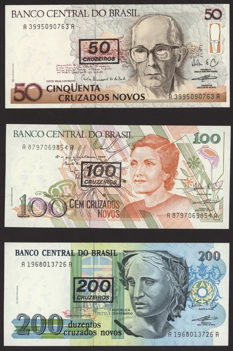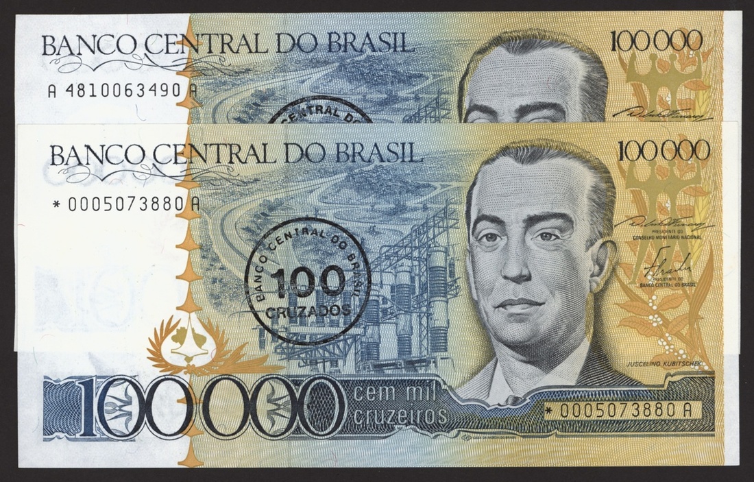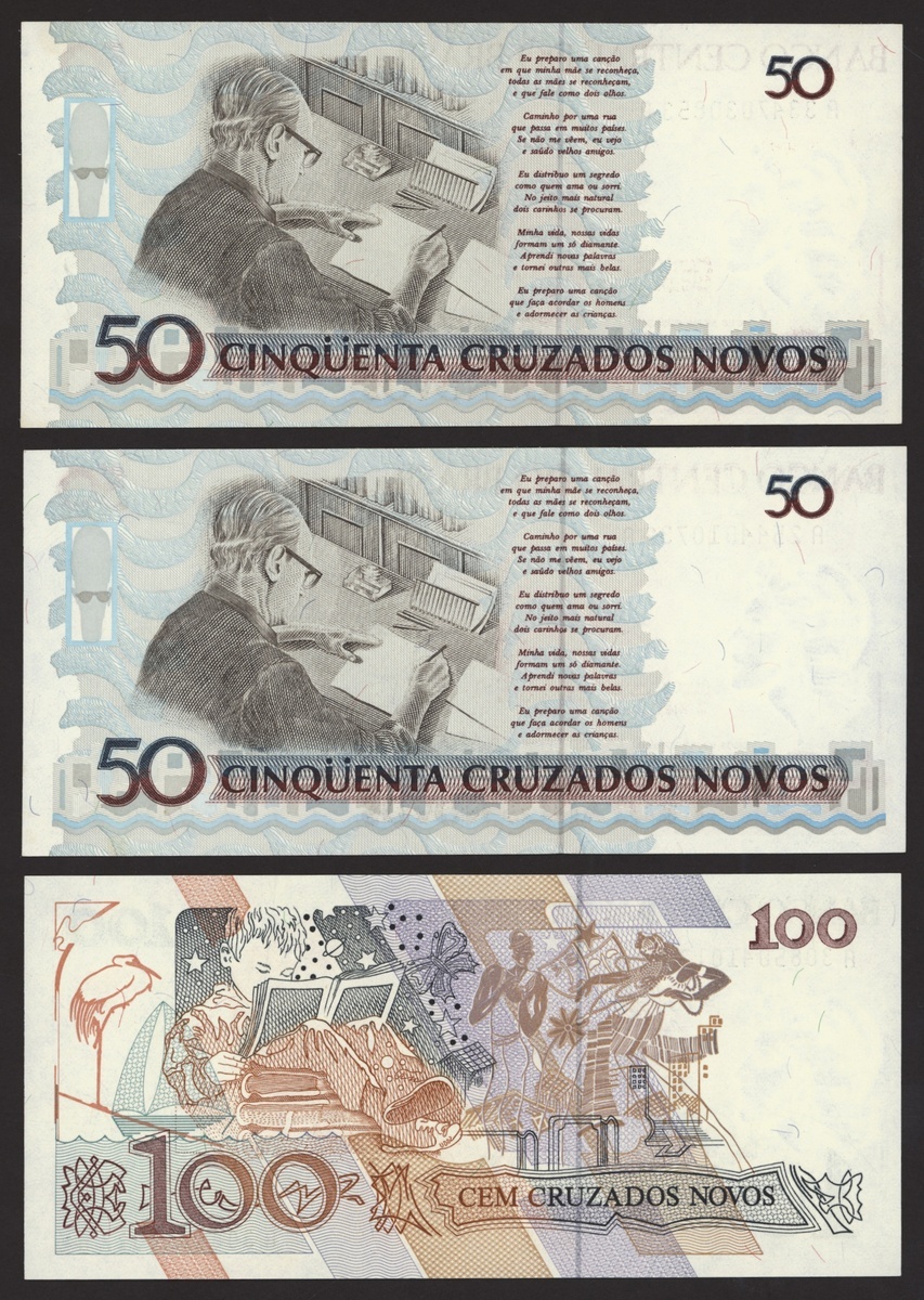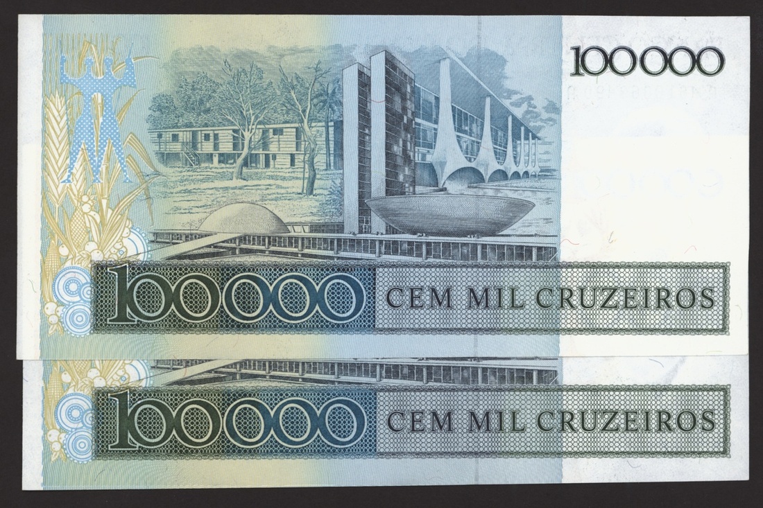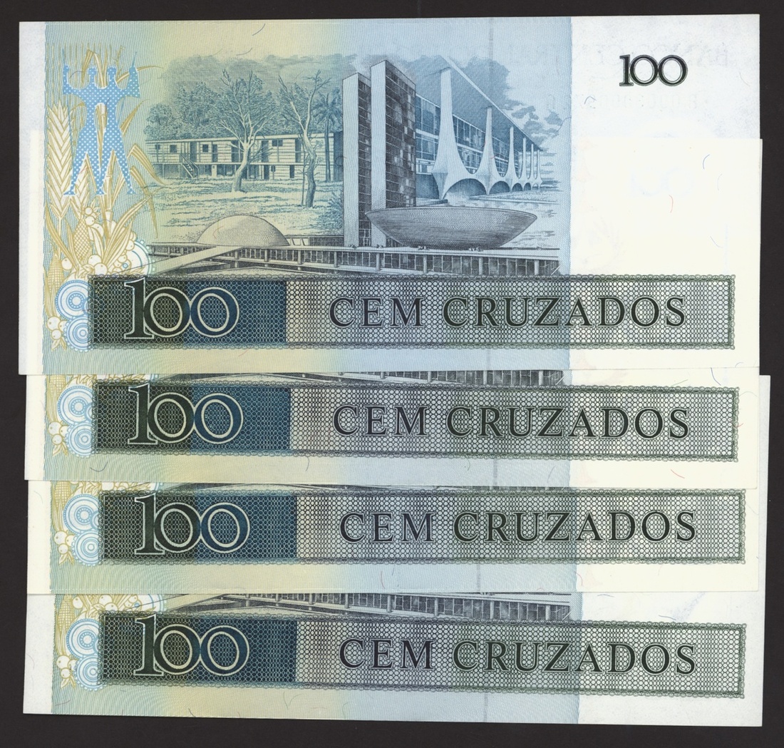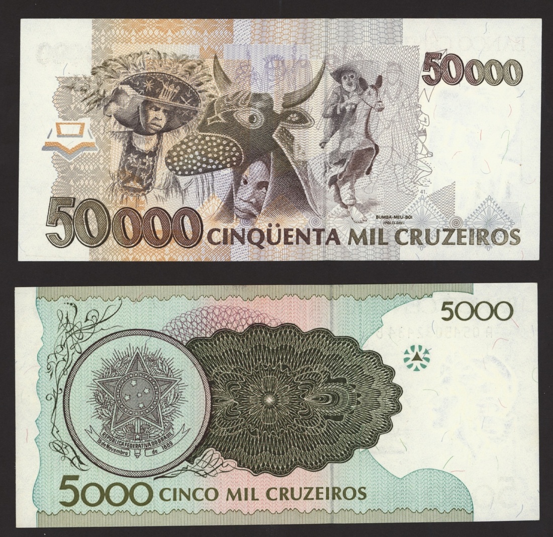 Banco Central do Brasil, a group from 1984-1994, 10,000 cruzeiros including a replacement (3), 50,000 cruzeiors (4), 100,000 cruzeiros, 1984-86 issues, 10 cruzados (2), 50 cruzados (2), 100 cruzados (2) 1986 provisional issues with one issued and one replacement, 10 cruzados (2), 50 cruzados (3), 100 cruzados (4), 1986-88 cruzado issues, 500 cruzados (4) 1986-88 issue, 1000 cruzados (2), 5000 cruzados, 10000 cruzados 1987-89 issues, 1 cruzados, 5 cruzados (2), 10 cruzados (2) 1989-1009 provisional cruzados novo issues, 50 cruzados novos (2), 100 cruzados novos (2) 1989-1990 issues, 200 cruzados 1989, 500 cruzados 1990, 50, 100, 200 and 500 cruzeiros 1990 issues, 100, 200, 500, 1000 (2), 5000 (3), 10000 (3), 50000, 100,000 (4), 500,000 (3), 1990-93 issues, 5,000 cruzeiros 1990 issue, 50, 100, 500 (2) 1993 provisional issues, 1,000, 5,000 and 50,000 cruzeiros reais, 1993-94 issues,