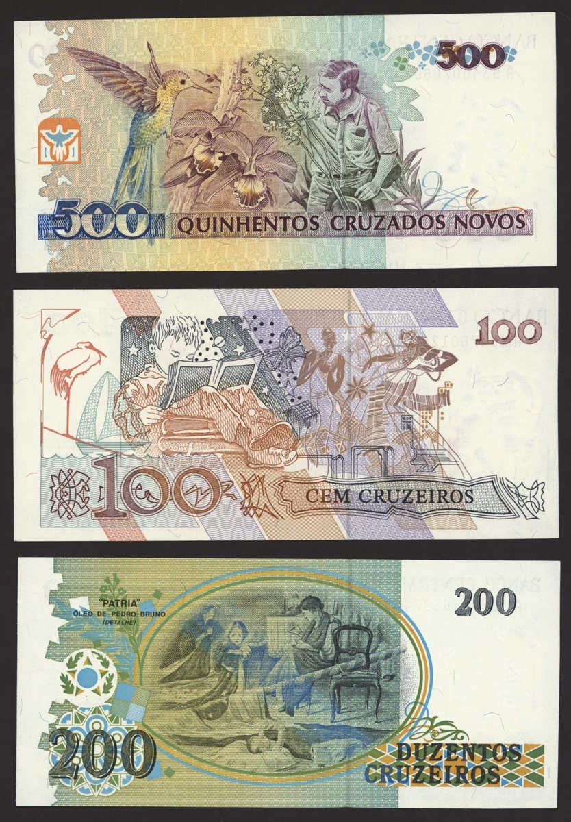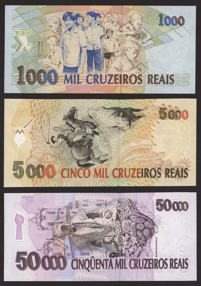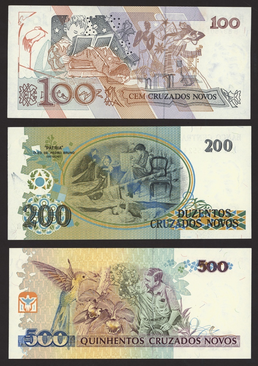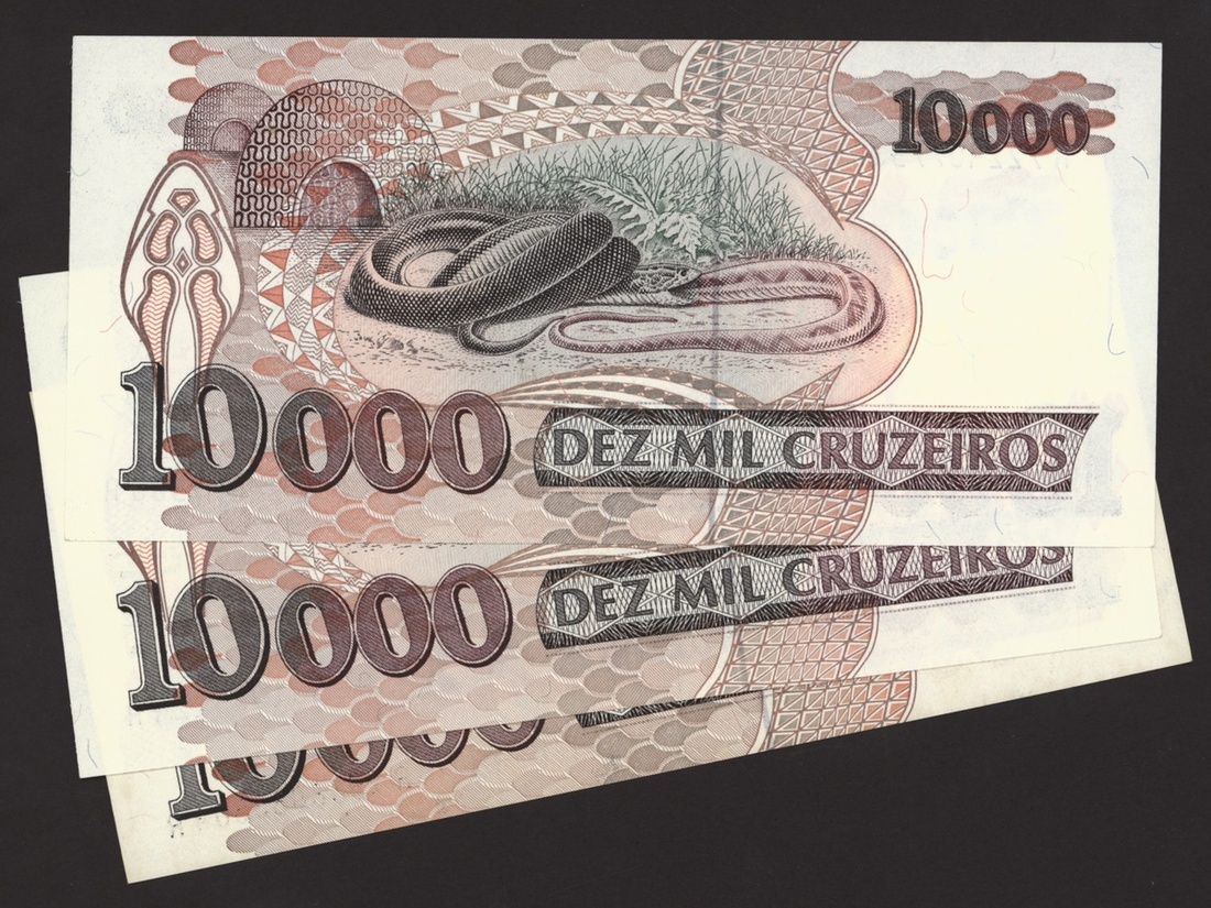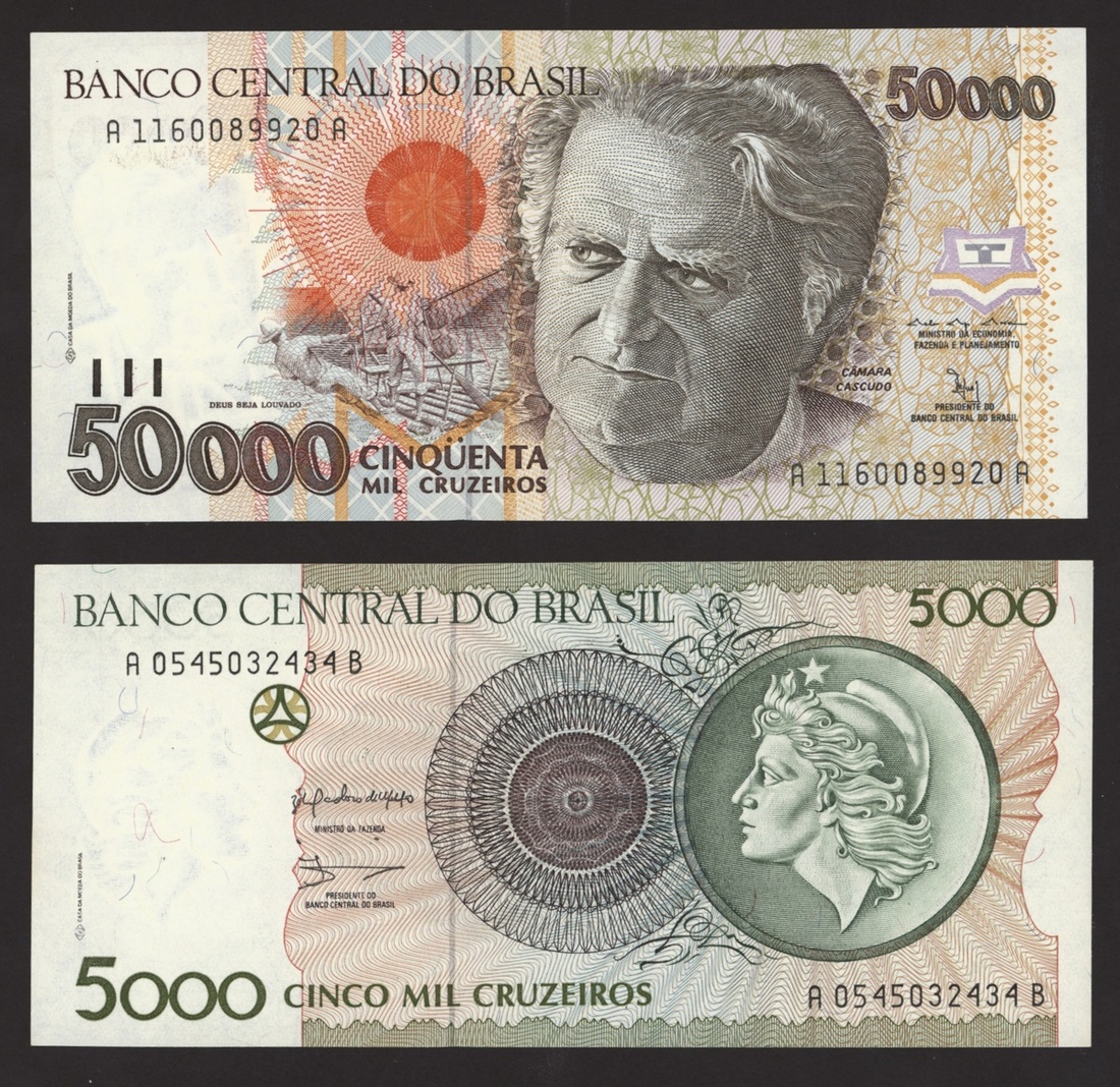 Banco Central do Brasil, a group from 1984-1994, 10,000 cruzeiros including a replacement (3), 50,000 cruzeiors (4), 100,000 cruzeiros, 1984-86 issues, 10 cruzados (2), 50 cruzados (2), 100 cruzados (2) 1986 provisional issues with one issued and one replacement, 10 cruzados (2), 50 cruzados (3), 100 cruzados (4), 1986-88 cruzado issues, 500 cruzados (4) 1986-88 issue, 1000 cruzados (2), 5000 cruzados, 10000 cruzados 1987-89 issues, 1 cruzados, 5 cruzados (2), 10 cruzados (2) 1989-1009 provisional cruzados novo issues, 50 cruzados novos (2), 100 cruzados novos (2) 1989-1990 issues, 200 cruzados 1989, 500 cruzados 1990, 50, 100, 200 and 500 cruzeiros 1990 issues, 100, 200, 500, 1000 (2), 5000 (3), 10000 (3), 50000, 100,000 (4), 500,000 (3), 1990-93 issues, 5,000 cruzeiros 1990 issue, 50, 100, 500 (2) 1993 provisional issues, 1,000, 5,000 and 50,000 cruzeiros reais, 1993-94 issues,