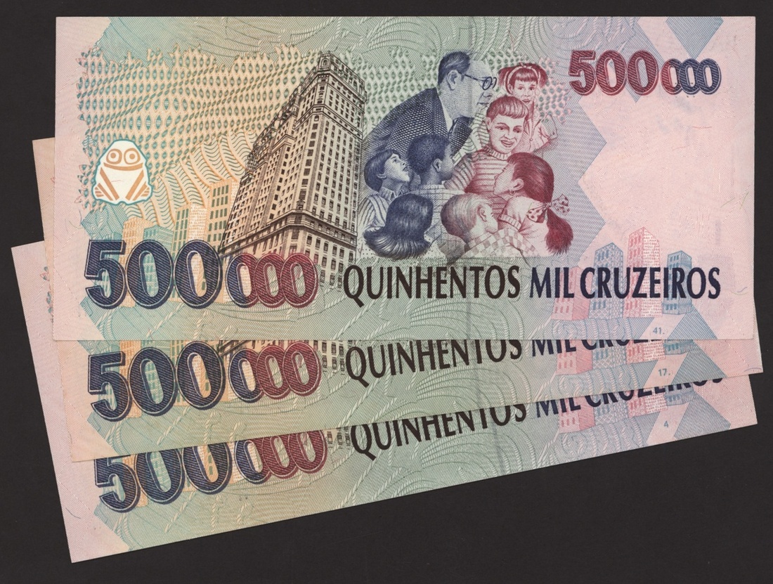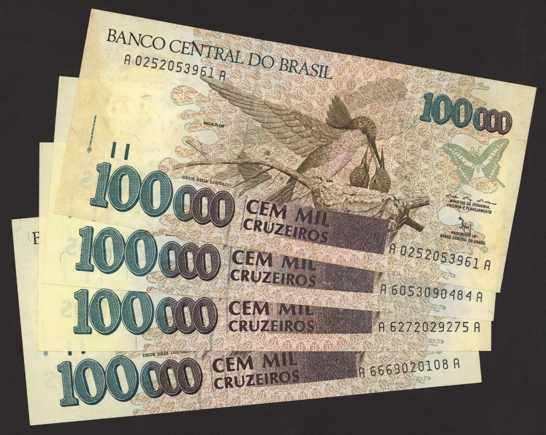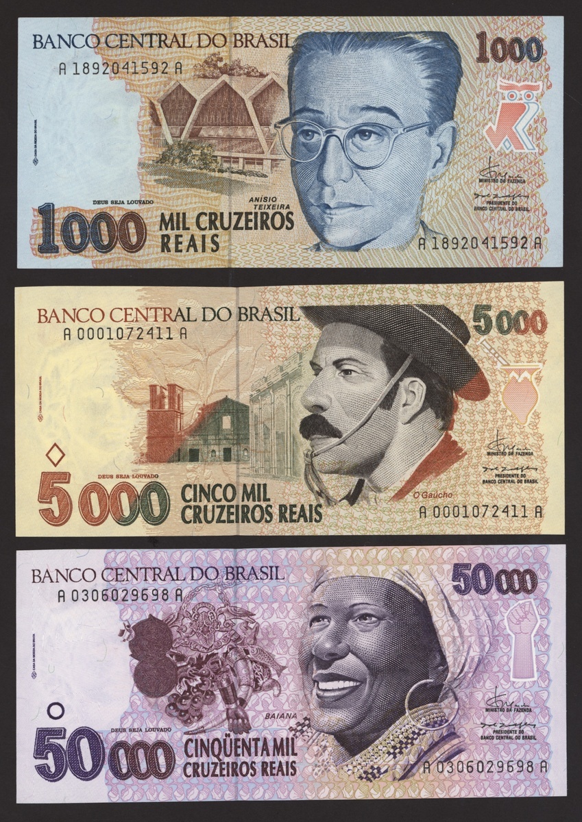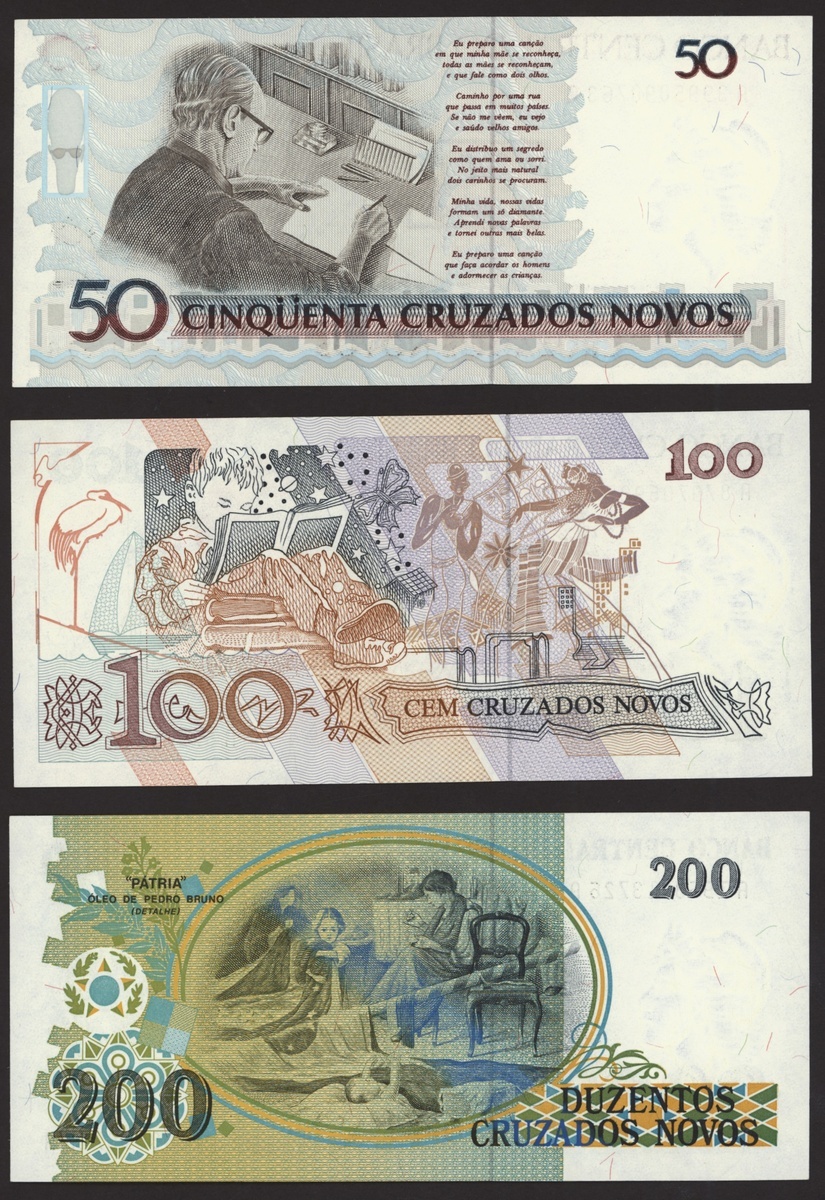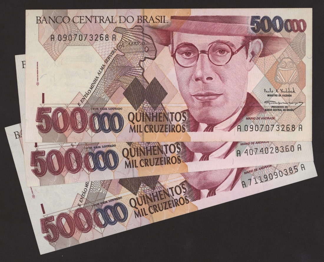 Banco Central do Brasil, a group from 1984-1994, 10,000 cruzeiros including a replacement (3), 50,000 cruzeiors (4), 100,000 cruzeiros, 1984-86 issues, 10 cruzados (2), 50 cruzados (2), 100 cruzados (2) 1986 provisional issues with one issued and one replacement, 10 cruzados (2), 50 cruzados (3), 100 cruzados (4), 1986-88 cruzado issues, 500 cruzados (4) 1986-88 issue, 1000 cruzados (2), 5000 cruzados, 10000 cruzados 1987-89 issues, 1 cruzados, 5 cruzados (2), 10 cruzados (2) 1989-1009 provisional cruzados novo issues, 50 cruzados novos (2), 100 cruzados novos (2) 1989-1990 issues, 200 cruzados 1989, 500 cruzados 1990, 50, 100, 200 and 500 cruzeiros 1990 issues, 100, 200, 500, 1000 (2), 5000 (3), 10000 (3), 50000, 100,000 (4), 500,000 (3), 1990-93 issues, 5,000 cruzeiros 1990 issue, 50, 100, 500 (2) 1993 provisional issues, 1,000, 5,000 and 50,000 cruzeiros reais, 1993-94 issues,