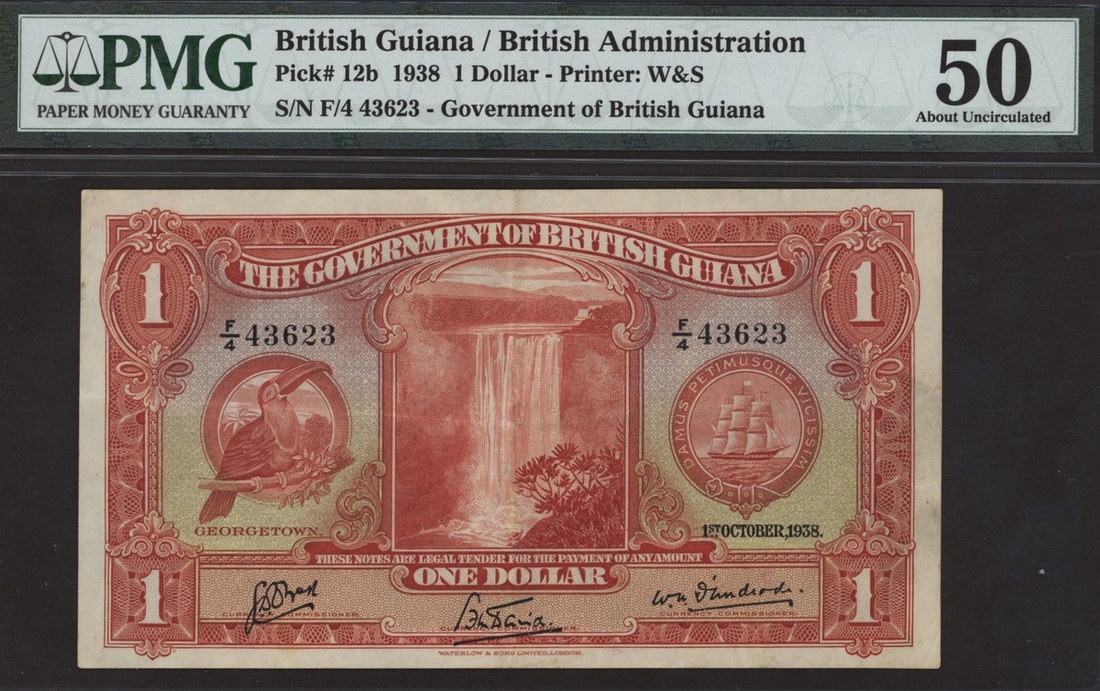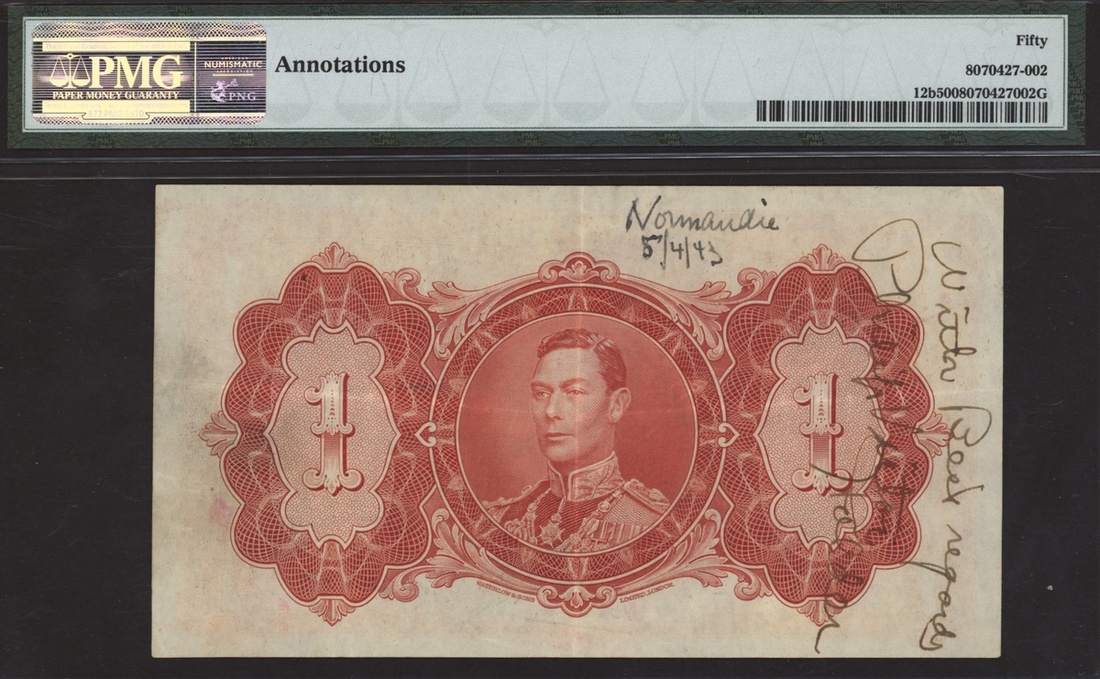 (x) Government of British Guiana, 1 dollar, 1 October 1938, serial number F/4 43623, (Pick 12b, TBB B107b), in PMG holder 50 about uncirculated, one of the top grades on PMG Population Report, annotations 'Normandie 5/4/43' 'With Best regards, Philip Viton Halden'