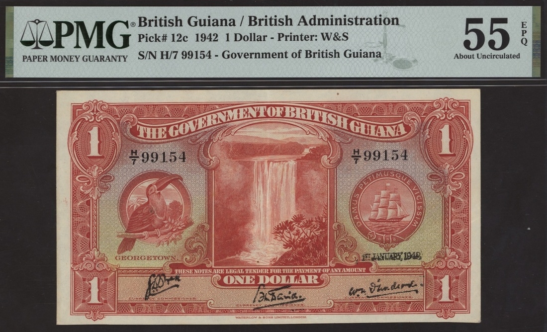 (x) Government of British Guiana, 1 dollar, 1 January 1942, serial number H/7 99154, (Pick 12c, BNB 107c), in PMG holder 55 EPQ About Uncirculated. A lovely original example