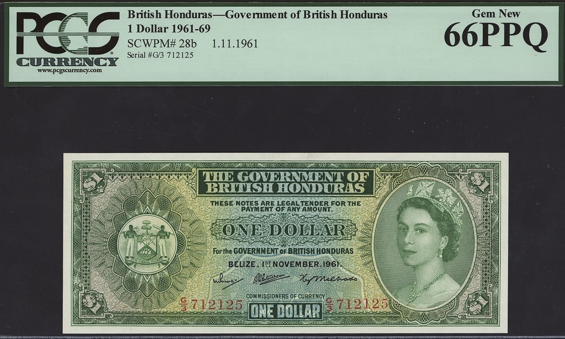 The Government of British Honduras, 1 dollar, 1961-69, serial number G/3 712125, (Pick 28b), in PCGS holder 66 PPQ gem new.