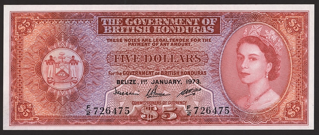 The Government of British Honduras, 5 dollars, 1973, serial number F/2 726475, (Pick 30a, B129a), uncirculated.