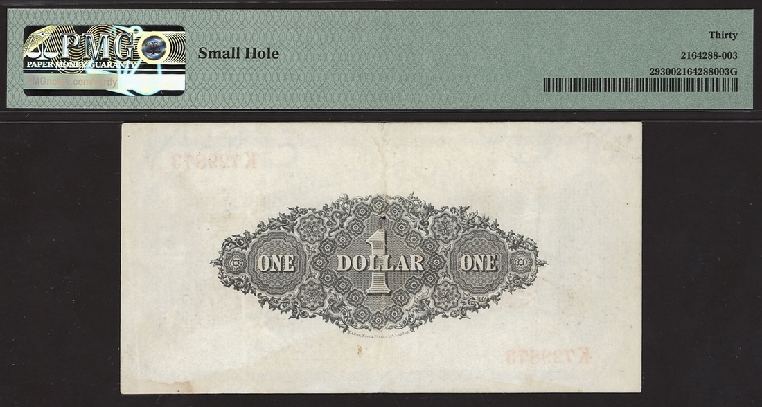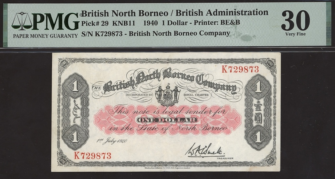 British Administration, British North Borneo, 1 dollar, 1940, serial number K729873, (Pick 29, KNB 11), in PMG holder 30 Very Fine, small hole.
