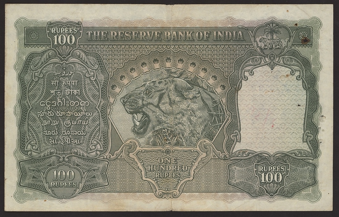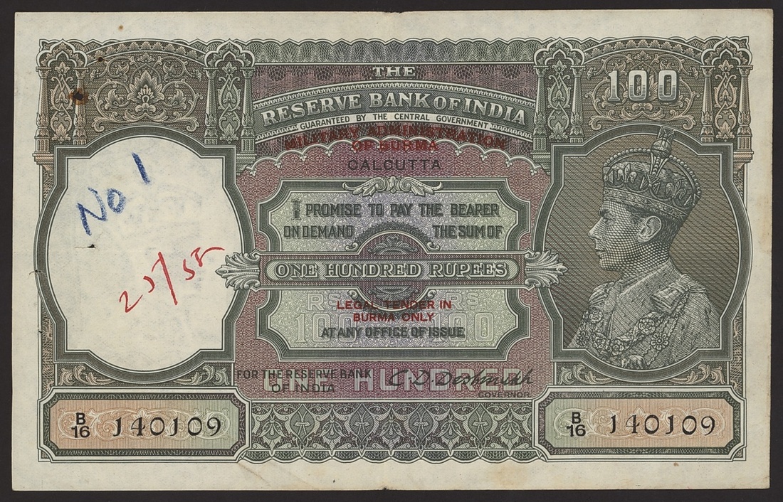 (x) Military Administration of Burma, 100 rupees, ND (1945), serial number B/16 140109, red overprint 'MILITARY ADMINISTRATION OF BURMA, LEGAL TENDER IN BURMA ONLY',