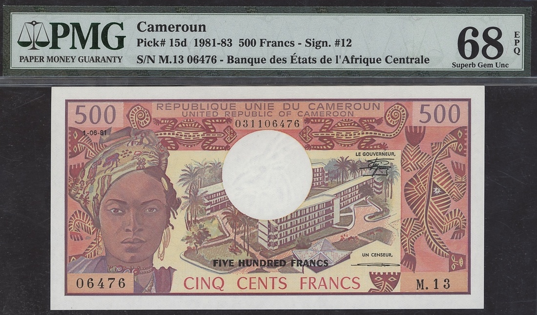 (x) Cameroun, Cameroon, 500 francs, 1981-83, serial number M13 06476, (Pick 15d), In PMG holder 68 EPQ Superb Gem Uncirculated