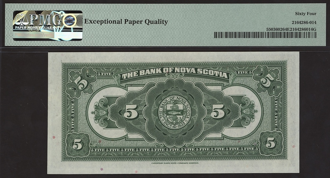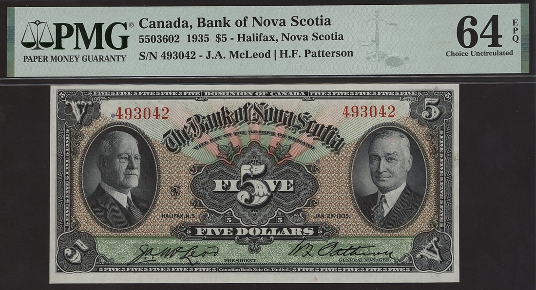 Bank of Nova Scotia, Canada, $5, Halifax, 2 January 1935, serial number 493042, signature McLeod and Patterson,