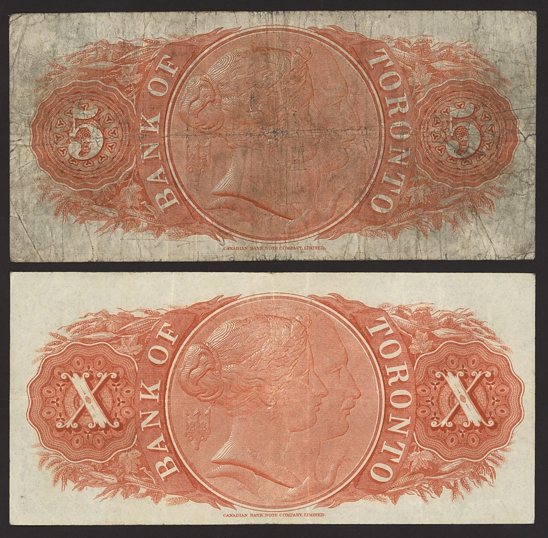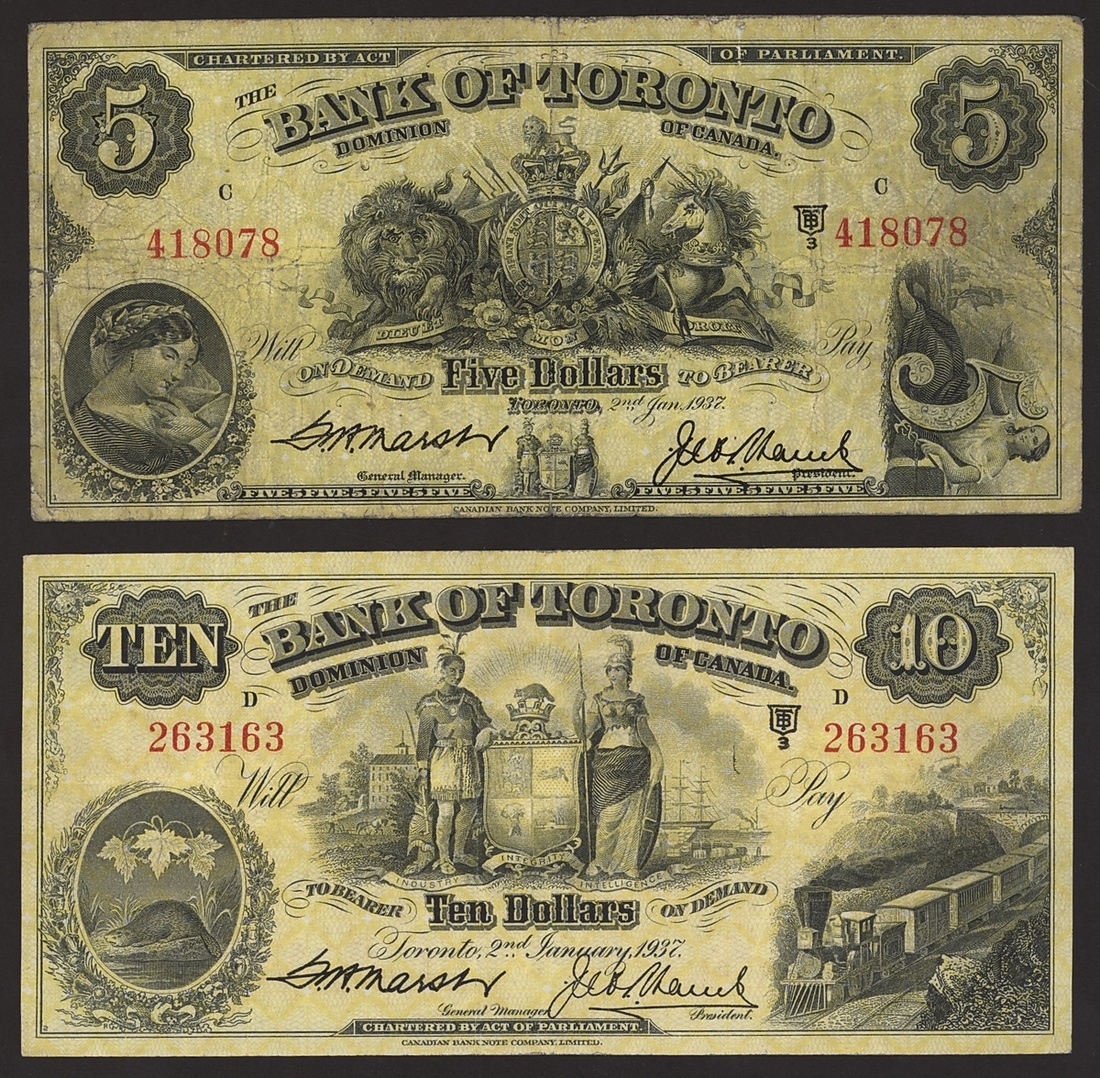 Bank of Toronto, Canada, $5 and $10, 2 January 1937, (Pick S691c, S692c, Charlton 715-26-06, 12), fine and pressed very fine respectively (2 notes)