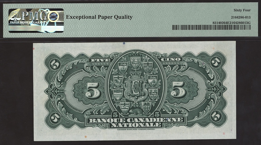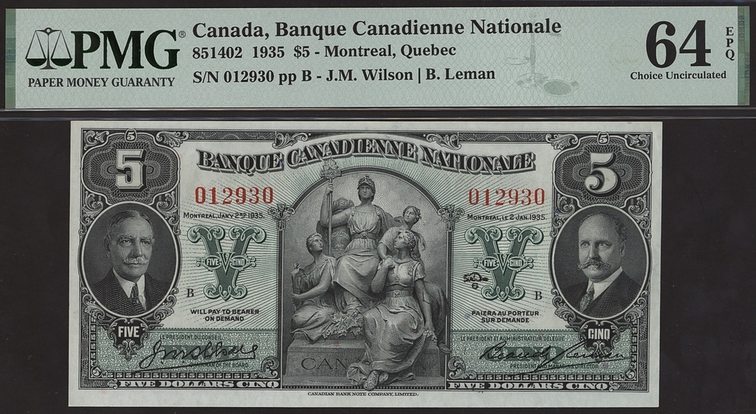 Banque Canadienne Nationale, Canada, $5, Montreal, 2 January 1935, serial number 012930, signature Wilson and Leman,