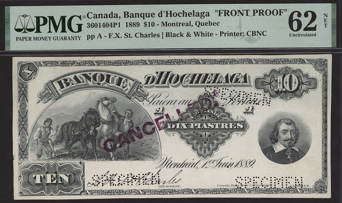 Banque d'Hochelaga, Canada, obverse proof for $10, Montreal, 1 June 1889, uniface, black and white,