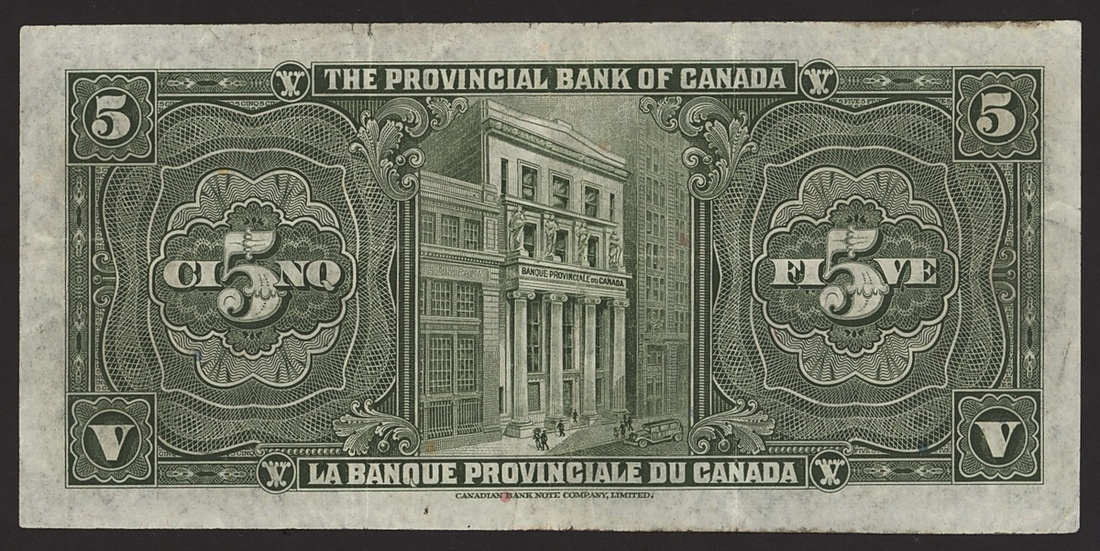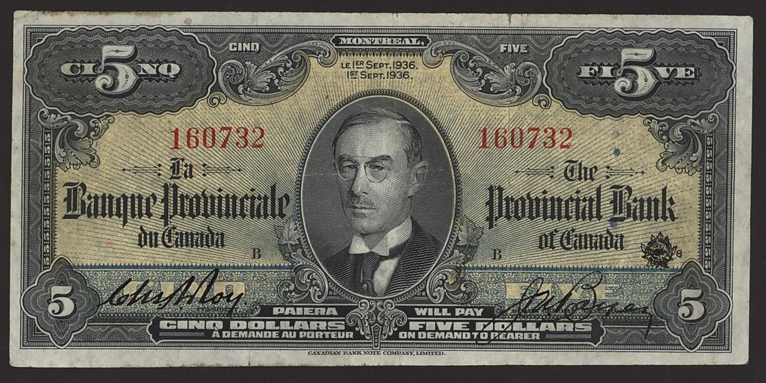The Provincial Bank of Canada, $5, 1 September 1936, serial number 160732, reverse in green,
