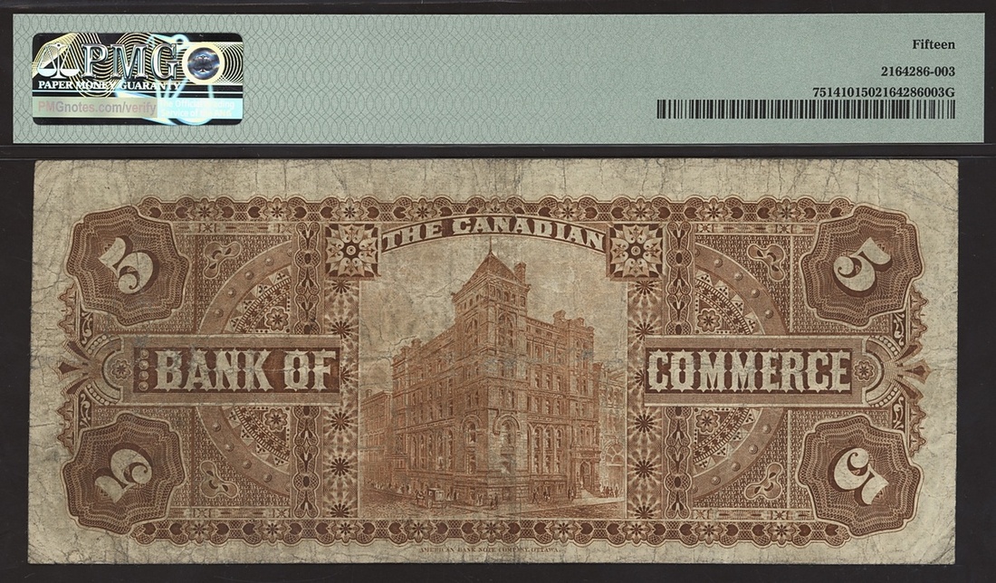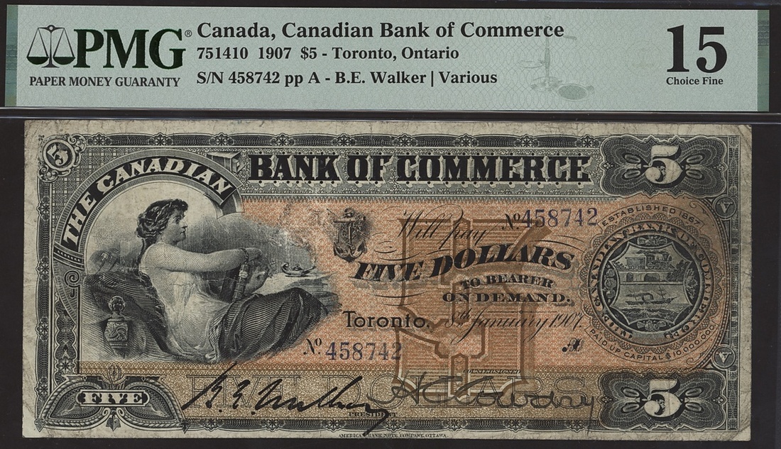 Bank of Commerce, Canada, $5, 8 January 1907, serial number 458742, signature Walker and one handsigned signature,