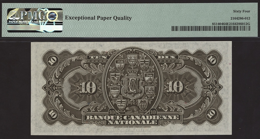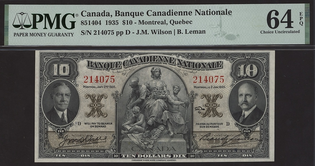 Banque Canadienne Nationale, Canada, $10, Montreal, 2 January 1935, serial number 214075, signature Wilson and Leman,