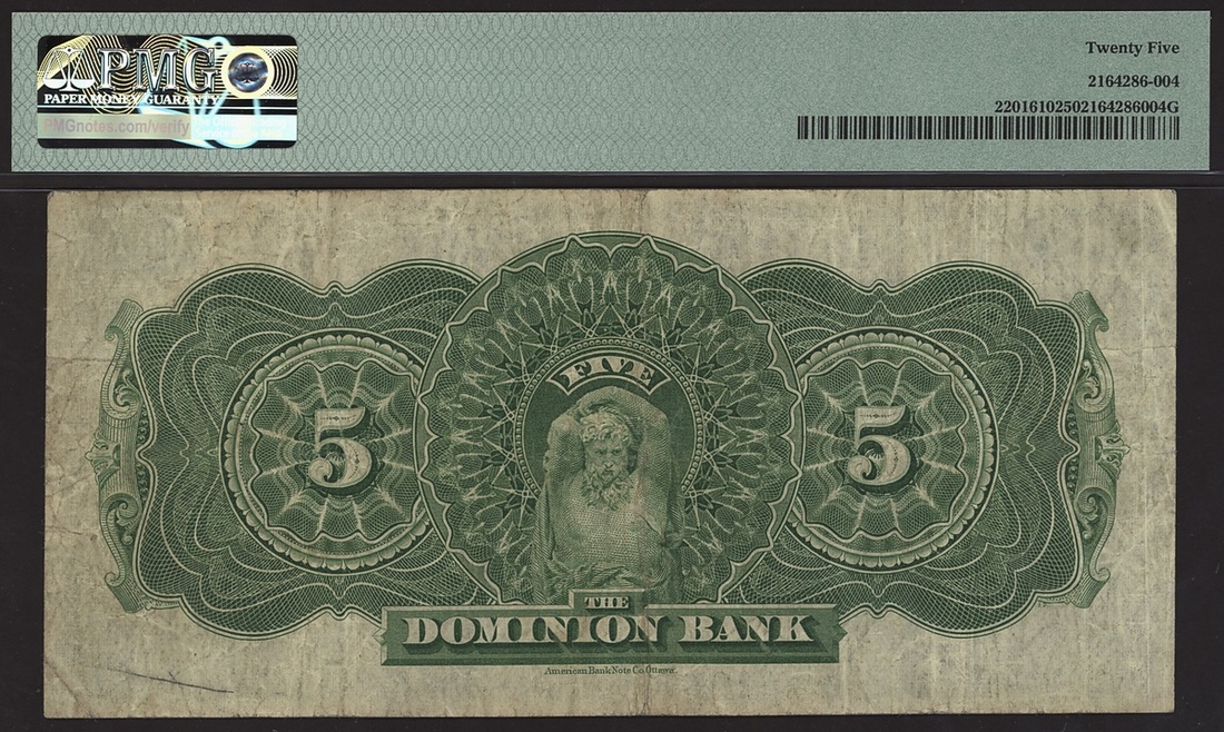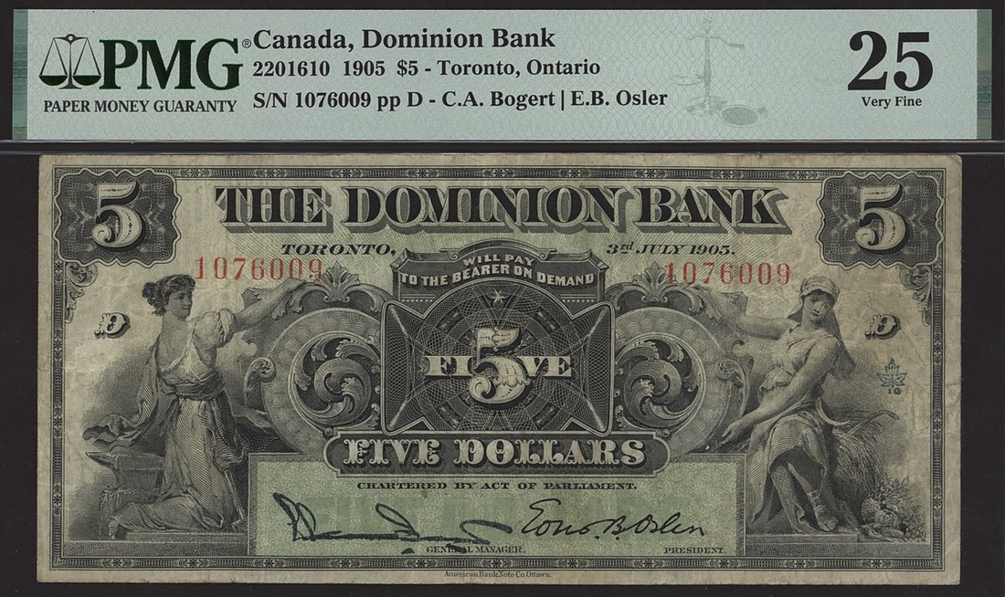 Dominion Bank, Canada, $5, 3 July 1905, serial number 1076009, signature Bogert and Osler,