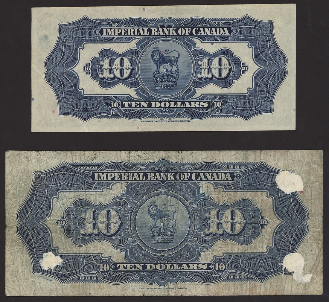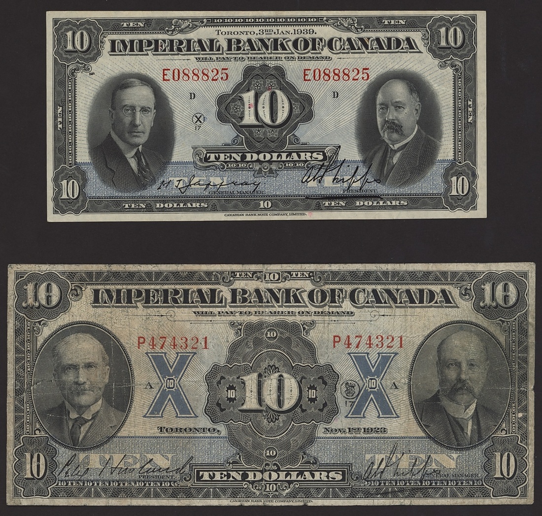 Imperial Bank of Canada, $10, 1 November 1923, serial number P474321, also a $10, 3 January 1939, serial number E088825,