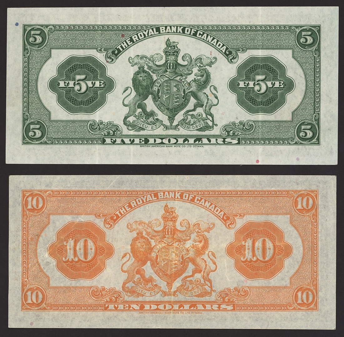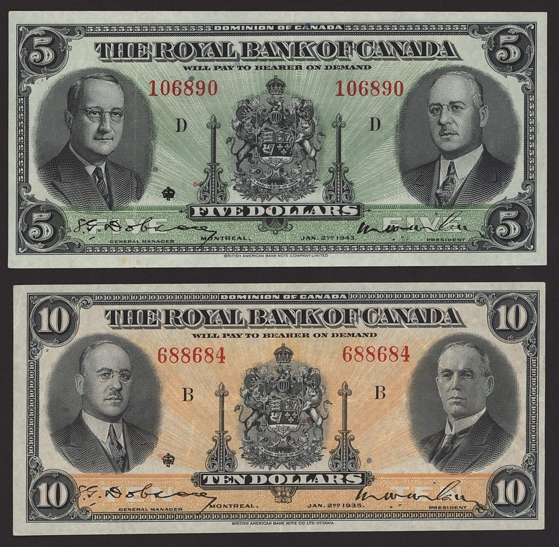 Royal Bank of Canada, $10, 2 January 1935, serial number 688684, also a $5, 2 January 1943, serial number 106890,