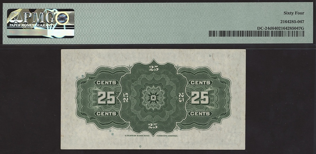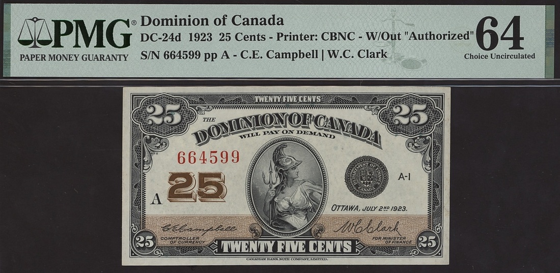 Dominion of Canada, 25 cents, 2 July 1923, serial number 664599, (Charlton DC-24d, Pick 11b), in PMG holder 64 Choice Uncirculated