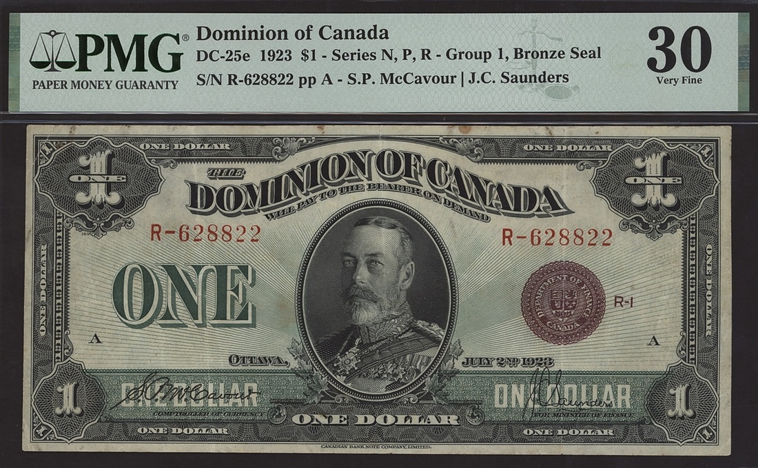 Dominion of Canada, $1, 2 July 1923, serial number R-628822, group 1, bronze seal, signature McCavour and Saunders,