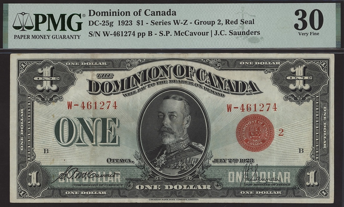 Dominion of Canada, $1, 2 July 1923, serial number W-461274, group 2, red seal, signature McCavour and Saunders,