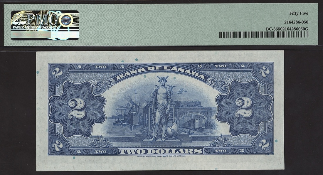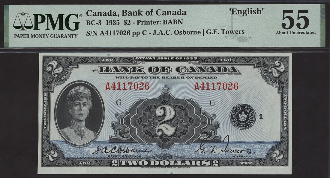 Bank of Canada, $2, 1935, serial number A4117026, (Charlton BC-3, Pick 40), in PMG holder 55 About Uncirculated