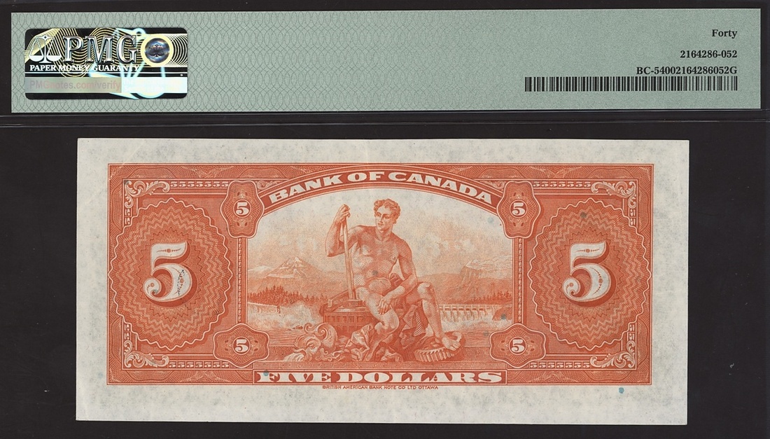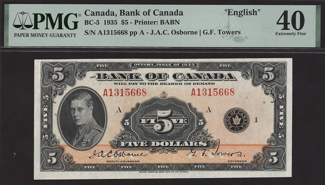 Bank of Canada, $5, 1935, serial number A1315668, (Charlton BC-5, Pick 42), in PMG holder 40 Extremely Fine