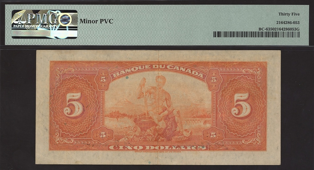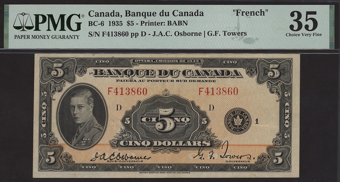 Banque du Canada, 'French text type', $5, 1935, serial number F413860, (Charlton BC-6, Pick 43), in PMG holder, minor PVC, 35 Choice Very Fine