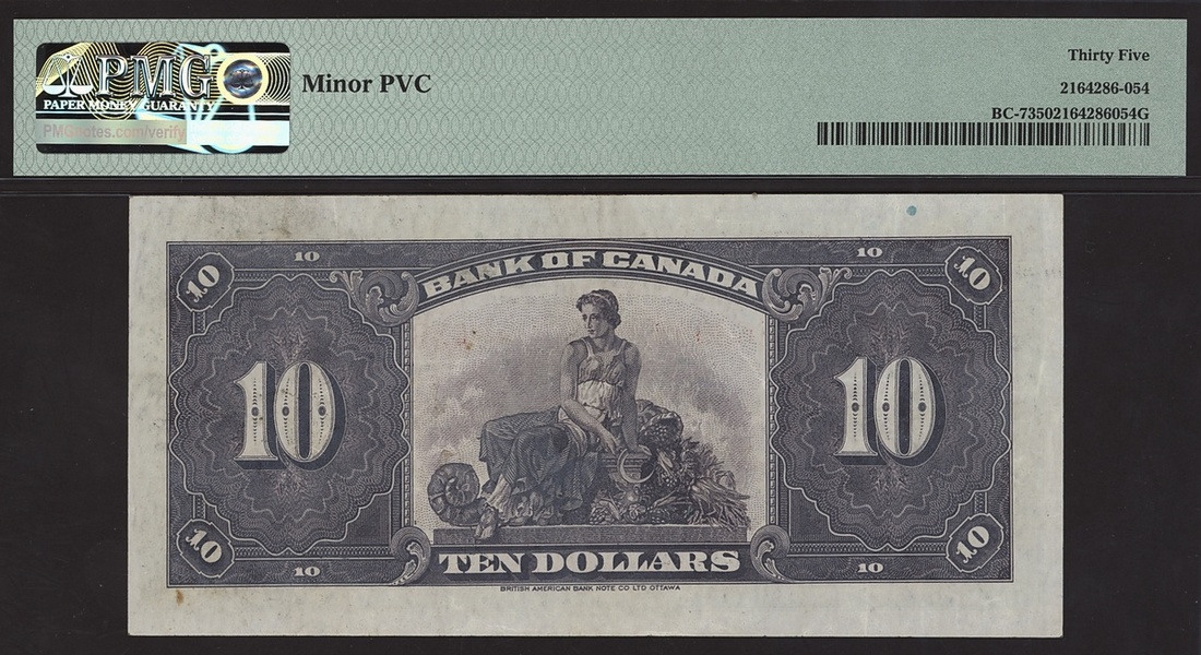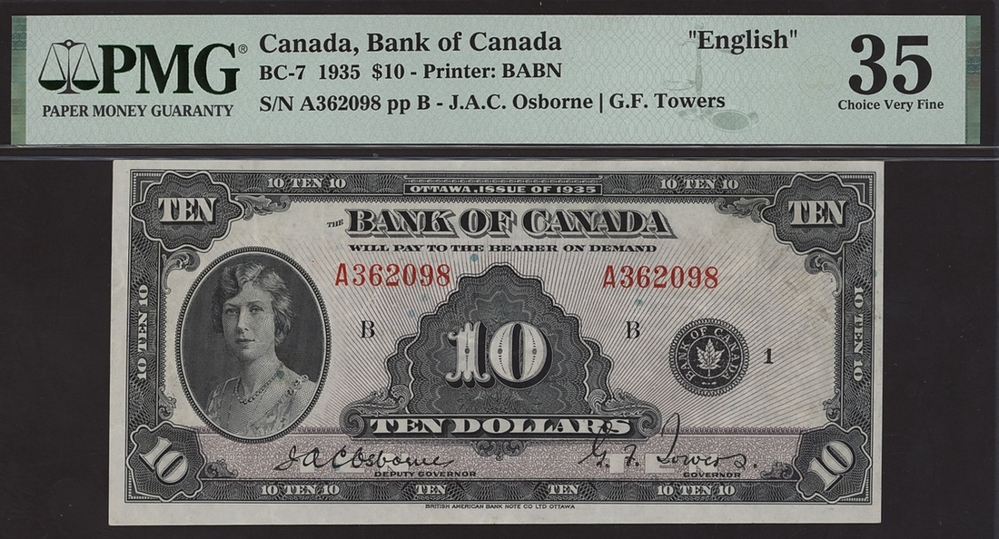 Bank of Canada, $10, 1935, serial number A362098, (Charlton BC-7, Pick 44), in PMG holder, minor PVC, 35 Choice Very Fine