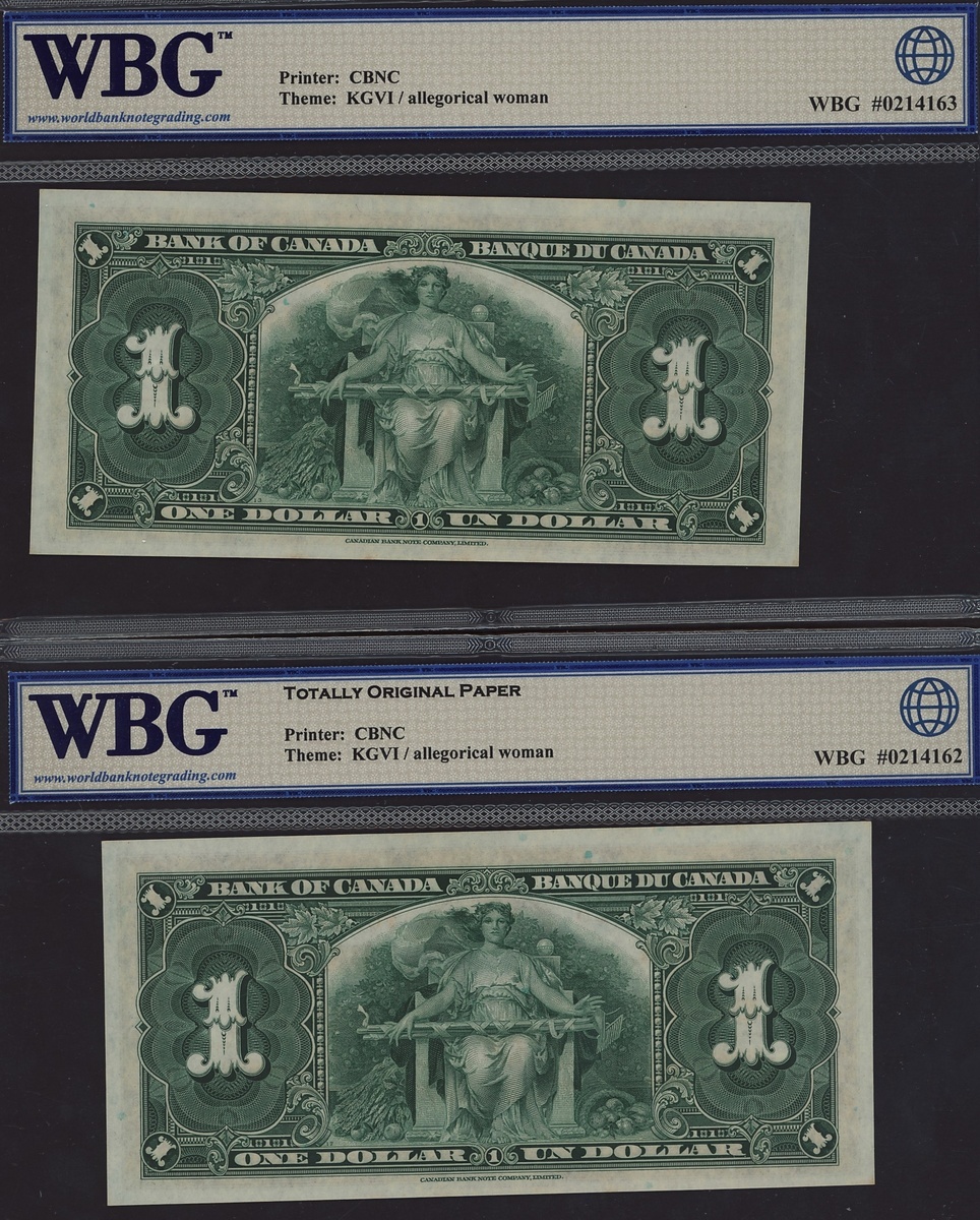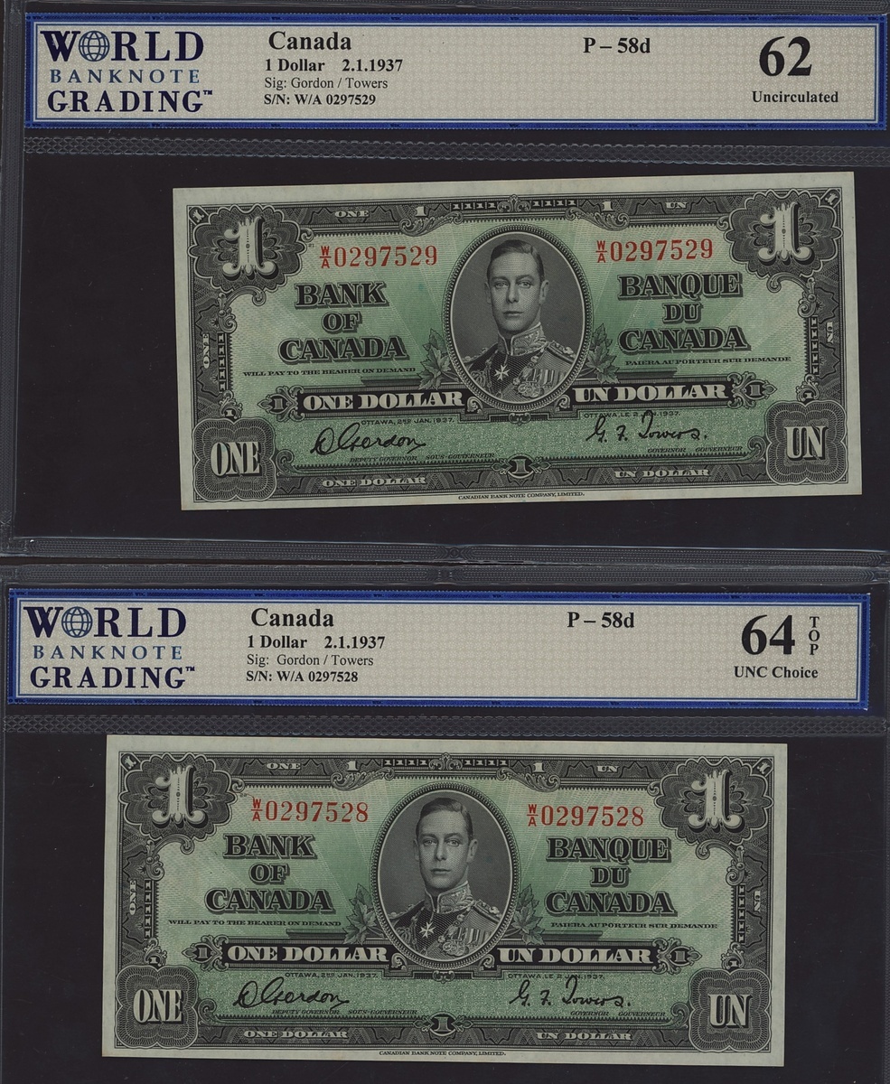 (x) Bank of Canada, consecutive pair of 1 dollar (2), 1937, serial numbers W/A 0297528/9, signature Gordon and Towers,