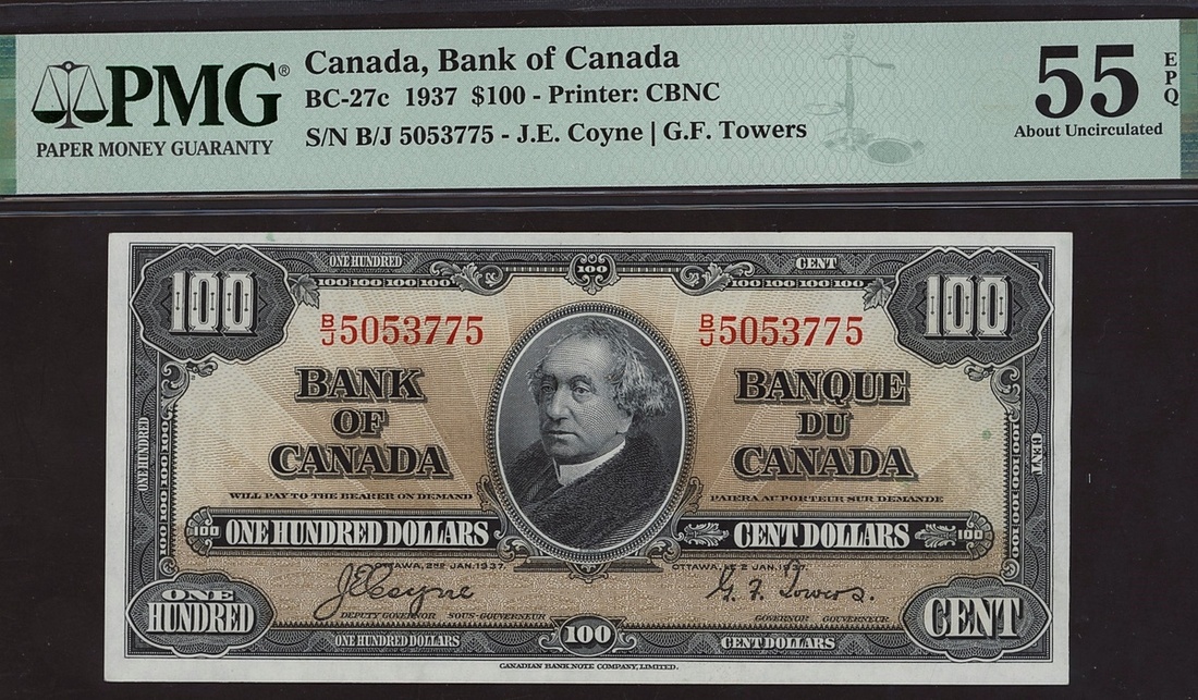 Bank of Canada, $100, 1937, serial number B/J 5053775, signature Coyne and Towers,