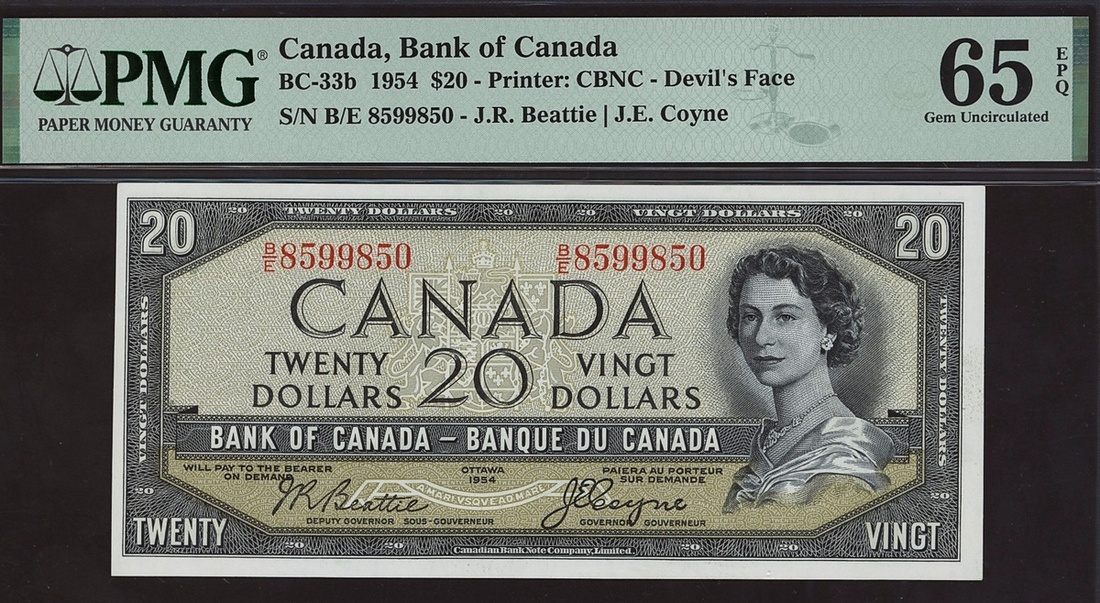 Bank of Canada, $20, 'Devil's Face', 1954, serial number B/E 8599850, signature Beattie and Coyne,