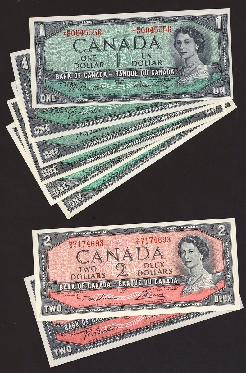 Bank of Canada, a group of QEII issues, including $1 (2), $2 and $5 1954, replacement $1 and $2 1954, Commemorative $1 (3) including a replacement,
