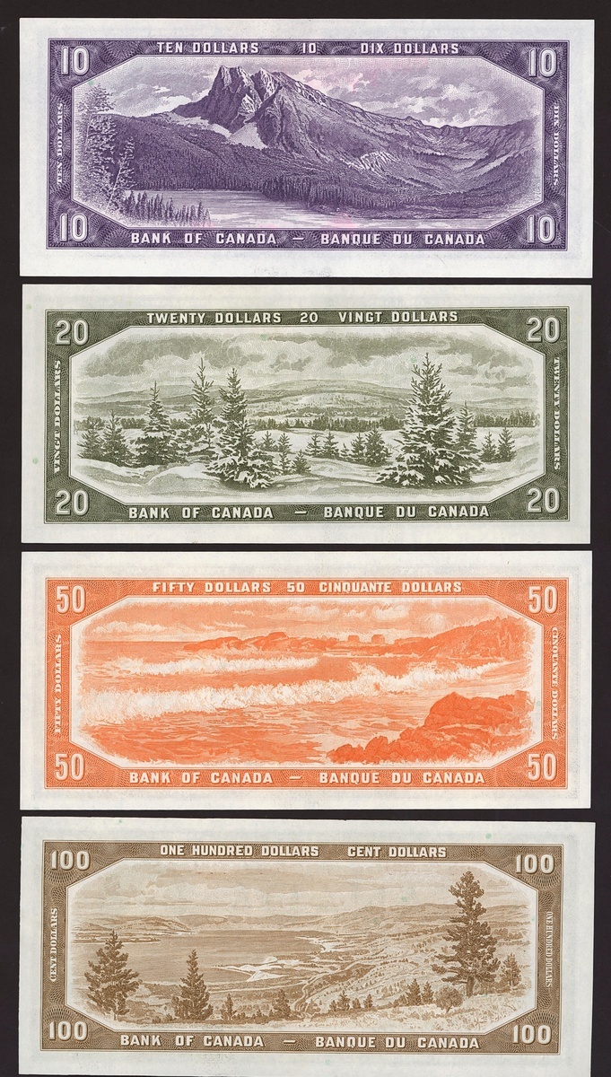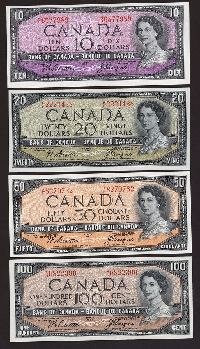 Bank of Canada, a partial set of the Modified Portrait 1954 series, including $10, $20, $50, $100, signature Beattie and Coyne,