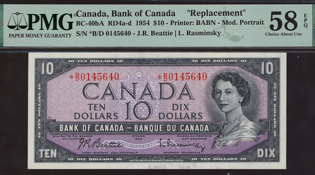 Bank of Canada, replacement $10, 1954, serial number *B/D 0145640, signature Beattie and Rasminsky,
