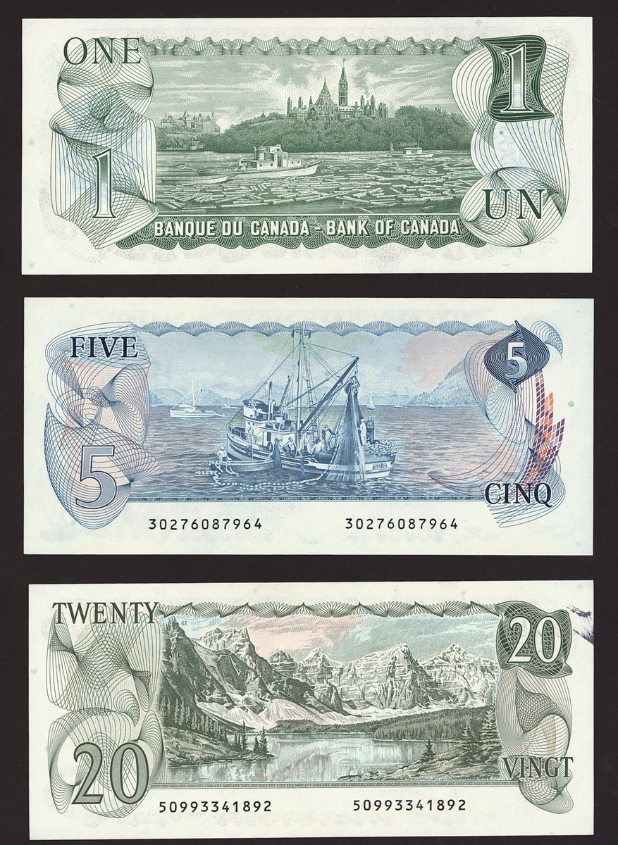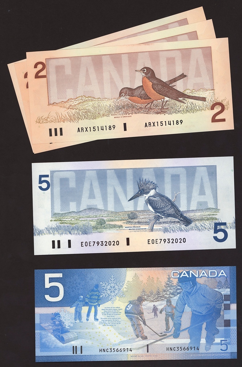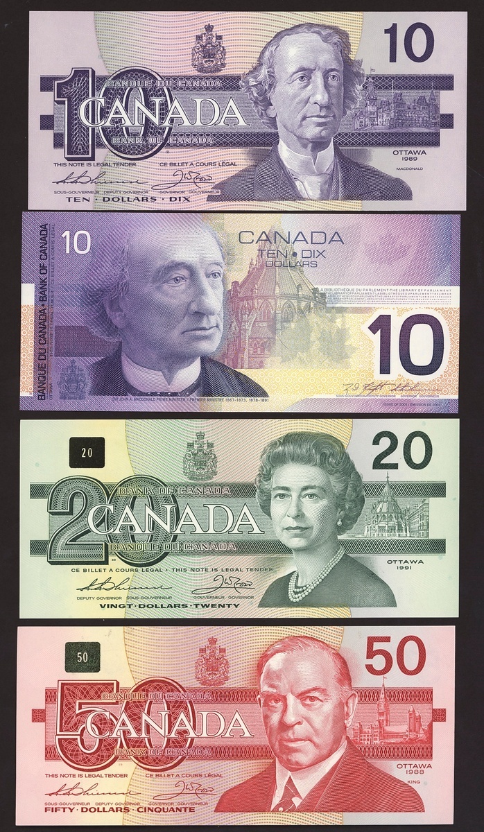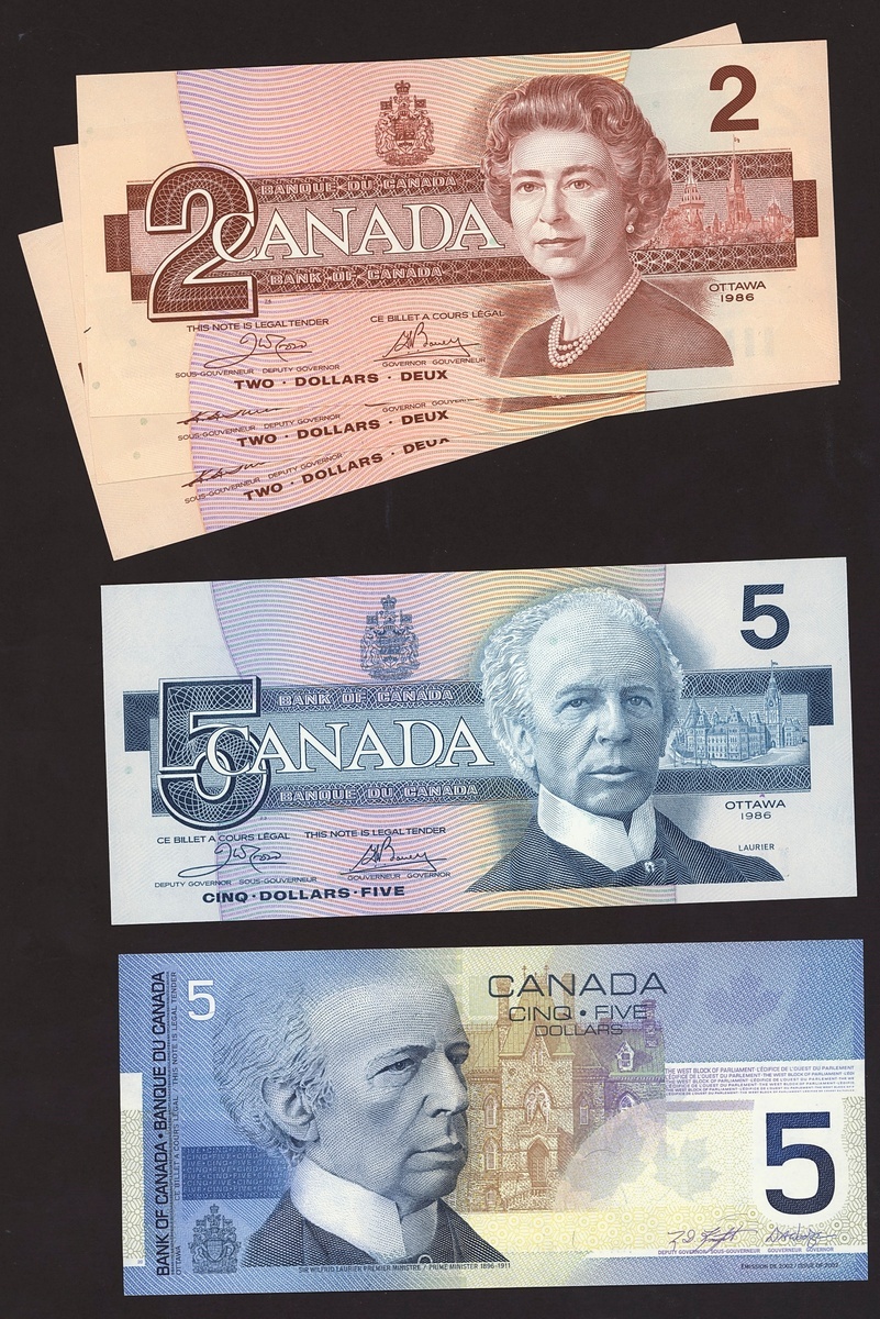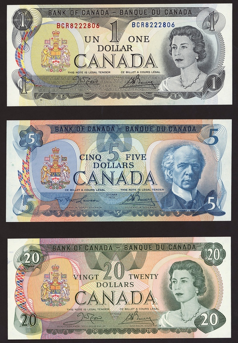 Bank of Canada, including 1 dollar 1973, 5 and 20 dollars 1979, 2 dollars (3), 5 dollars, 10 dollars, 20 dollars, 50 dollars, 5 and 10 dollars 2000-05,