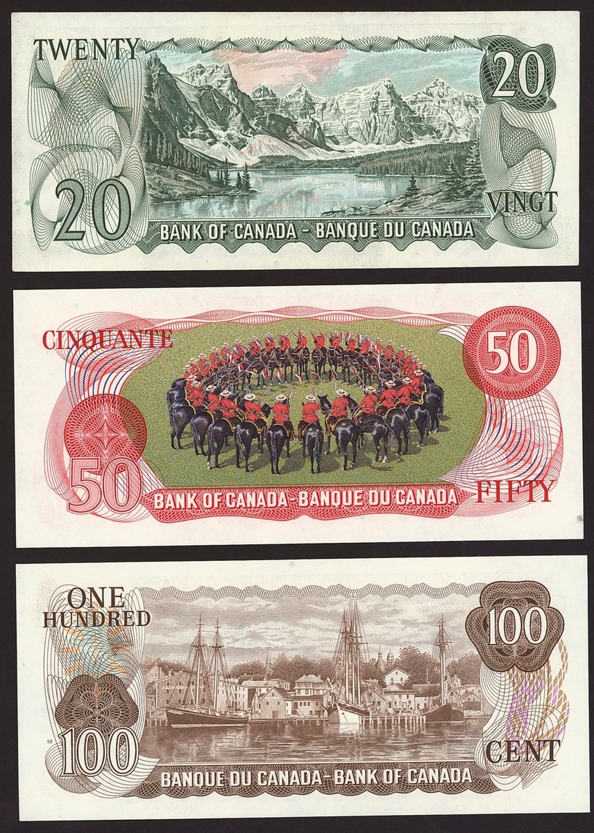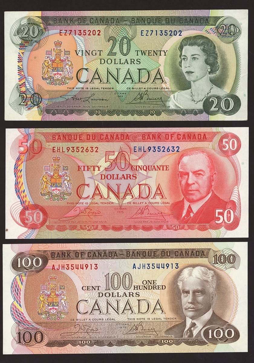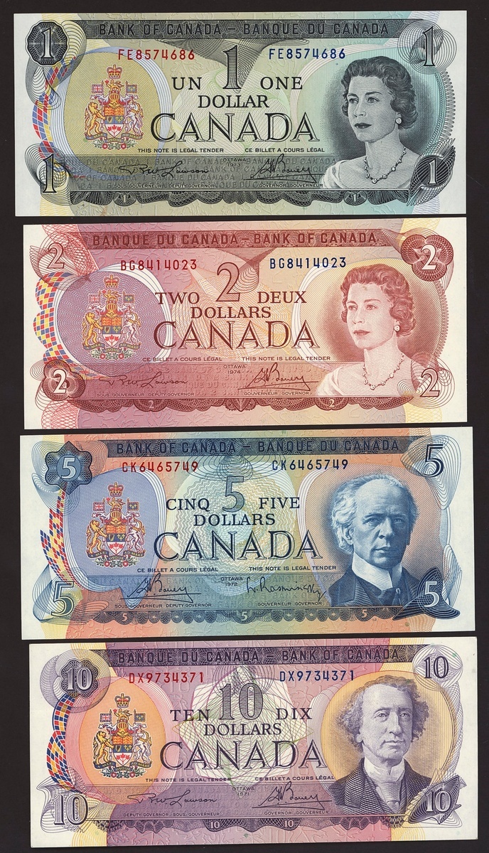 Bank of Canada, a full set of the 1969-79 series, including $1 1973, $2 1974, $5 1972, $10 1971, $20 1969, $50 1975, $100 1975,